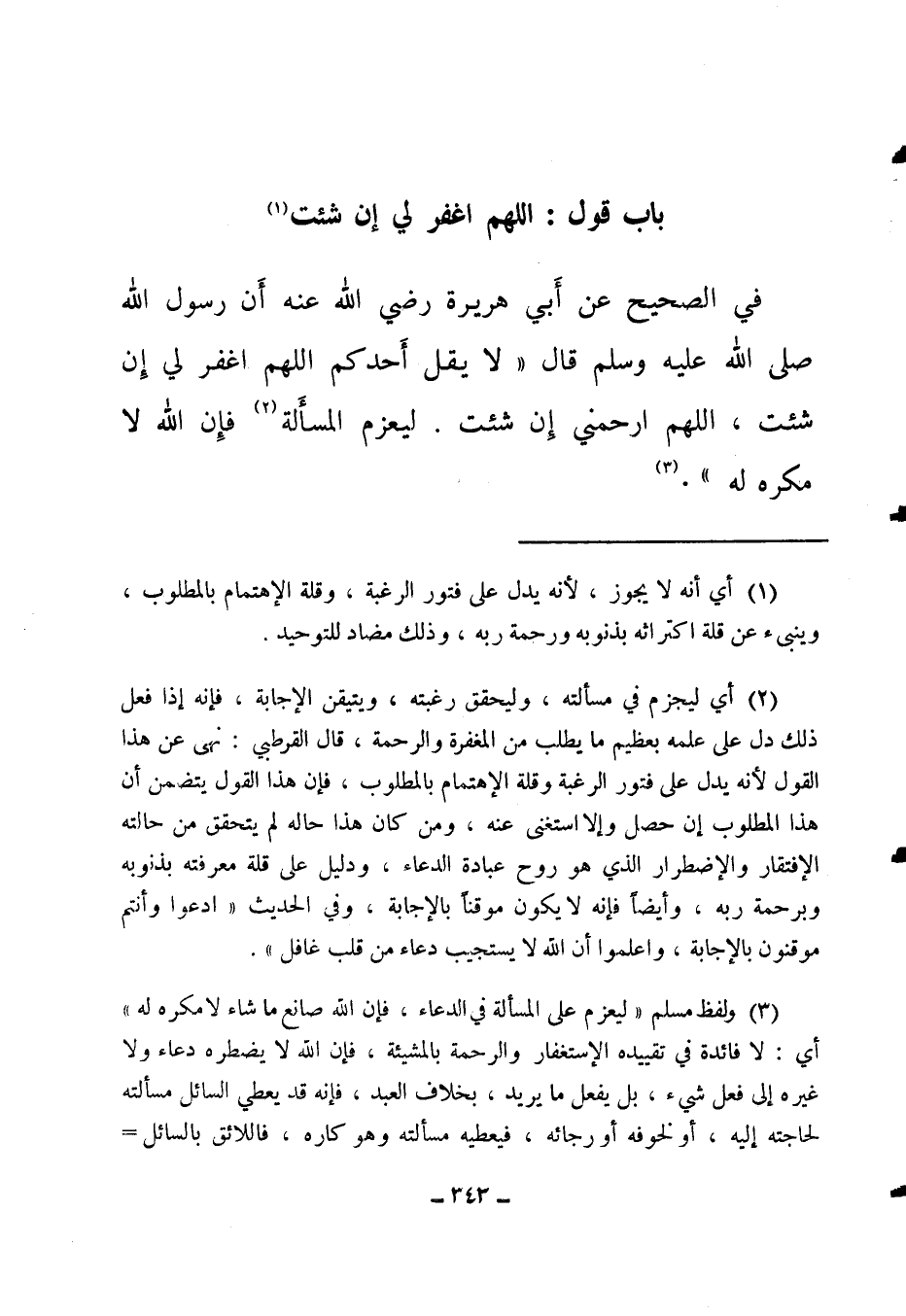 (2) أي ليجزم في مسألته، وليحقق رغبته، ويتيقن الإجابة؛ فإنه إذا فعل ذلك دل على علمه بعظيم ما يطلب من المغفرة والرحمة، قال القرطبي: نهى عن هذا القول؛ لأنه يدل على فتور الرغبة وقلة الاهتمام بالمطلوب، فإن هذا القول يتضمن أن هذا المطلوب إن حصل وإلا استغنى عنه، ومن كان هذا حاله لم يتحقق من حالته الافتقار والاضطرار الذي هو روح عبادة الدعاء، ودليل على قلة معرفته بذنوبه وبرحمة ربه، وأيضا فإنه لا يكون موقنا بالإجابة، وفي الحديث: " ادعوا وأنتم موقنون بالإجابة، واعلموا أن الله لا يستجيب دعاء من قلب غافل "2.