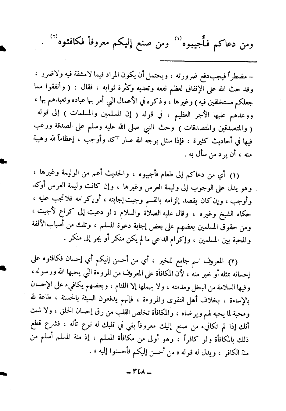 (2) المعروف اسم جامع للخير، أي من أحسن إليكم أي إحسان فكافئوه على إحسانه بمثله أو خير منه، لأن المكافأة على المعروف من المروءة التي يحبها الله ورسوله، وفيها السلامة من البخل ومذمته، ولا يهملها إلا اللئام، وبعضهم يكافئ على الإحسان بالإساءة، بخلاف أهل التقوى والمروءة، فإنهم يدفعون السيئة بالحسنة، طاعة لله ومحبة لما يحبه لهم ويرضاه، والمكافأة تخلص القلب من رق إحسان الخلق، ولا شك أنك إذا لم تكافئ من صنع إليك معروفا بقي في قلبك له نوع تأله، فشرع قطع ذلك بالمكافأة ولو كافرا، وهو أولى من مكافأة المسلم، إذ منة المسلم أسلم من منة الكافر، ويدل له قوله: " من أحسن إليكم فأحسنوا إليه ".