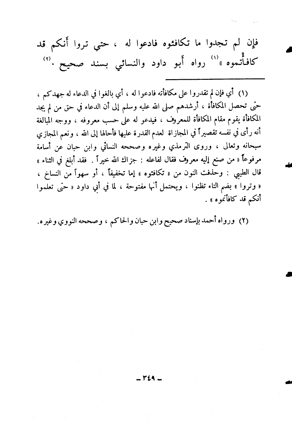 فإن لم تجدوا ما تكافئونه فادعوا له، حتى تروا أنكم قد كافأتموه (1) " 1 رواه أبو داود والنسائي بسند صحيح (2) .
