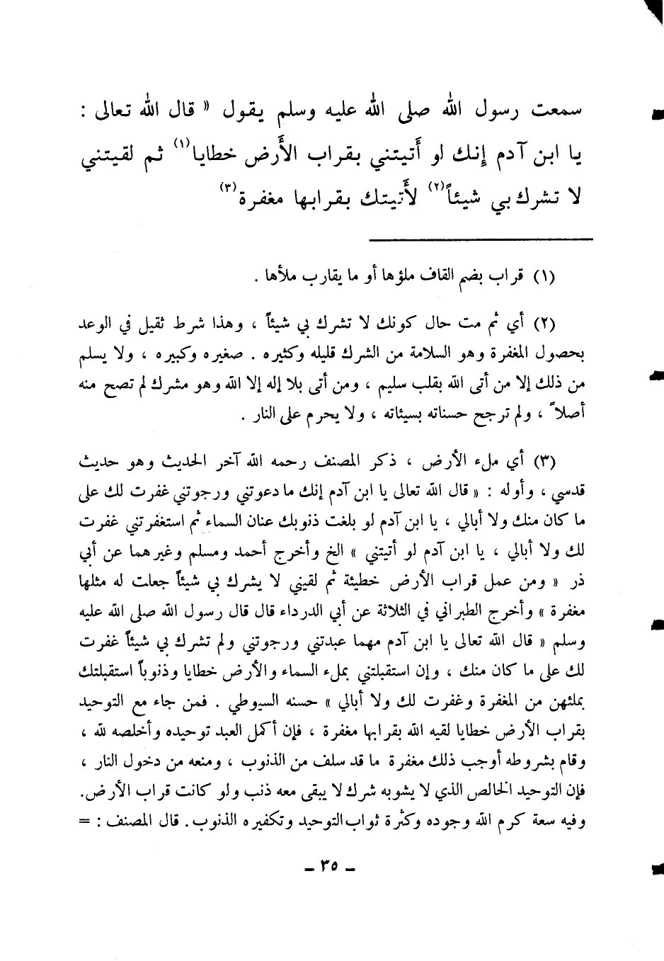 (2) أي ثم مت حال كونك لا تشرك بي شيئا، وهذا شرط ثقيل في الوعد بحصول المغفرة وهو السلامة من الشرك قليله وكثيره، صغيره وكبيره، ولا يسلم من ذلك إلا من أتى الله بقلب سليم، ومن أتى بلا إله إلا الله وهو مشرك لم تصح منه أصلا، ولم ترجح حسناته بسيئاته، ولا يحرم على النار.