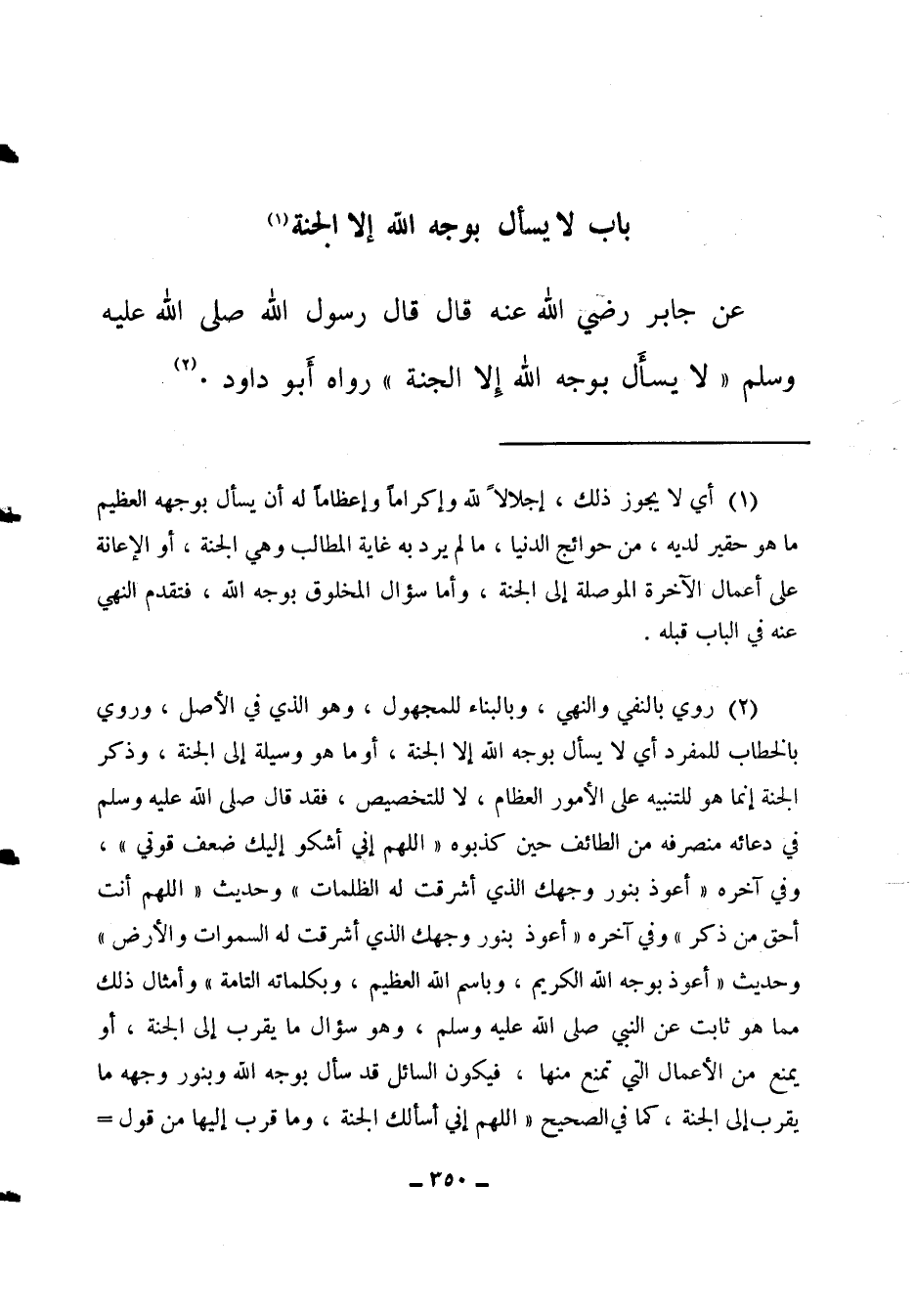 عن جابر رضي الله عنه قال: قال رسول الله صلى الله عليه وسلم: " لا يسأل بوجه الله إلا الجنة "1. رواه أبو داود (2) . ـــــــــــــــــــــــــــــ