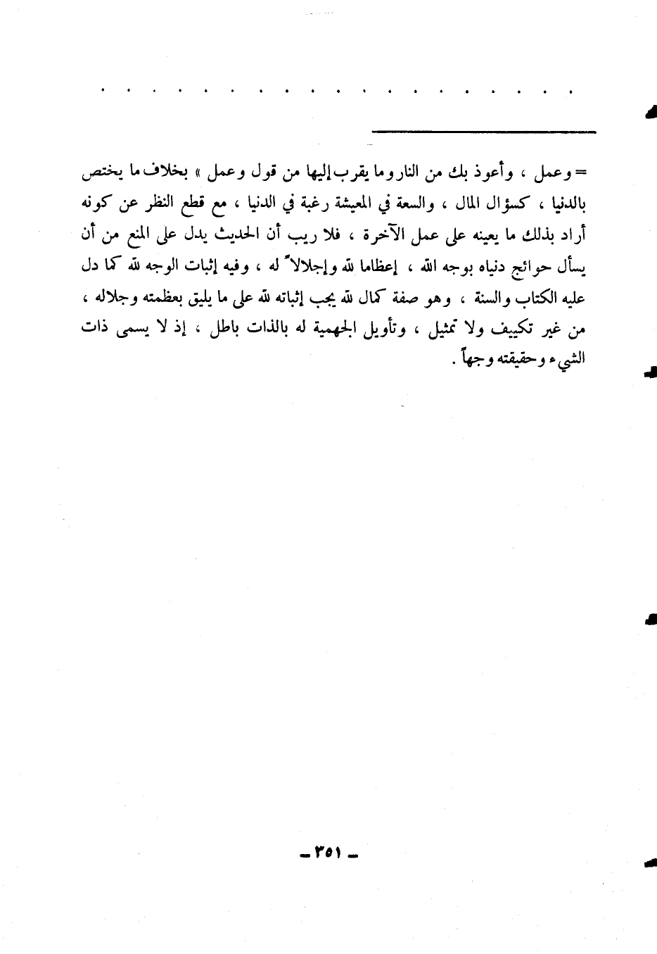 = وعمل، وأعوذ بك من النار وما يقرب إليها من قول وعمل "1. بخلاف ما يختص بالدنيا، كسؤال المال، والسعة في المعيشة رغبة في الدنيا، مع قطع النظر عن كونه أراد بذلك ما يعينه على عمل الآخرة، فلا ريب أن الحديث يدل على المنع من أن يسأل حوائج دنياه بوجه الله، إعظاما لله وإجلالا له، وفيه إثبات الوجه لله كما دل عليه الكتاب والسنة، وهو صفة كمال لله يجب إثباته لله على ما يليق بعظمته وجلاله، من غير تكييف ولا تمثيل. وتأويل الجهمية له بالذات باطل، إذ لا يسمى ذات الشيء وحقيقته وجها.