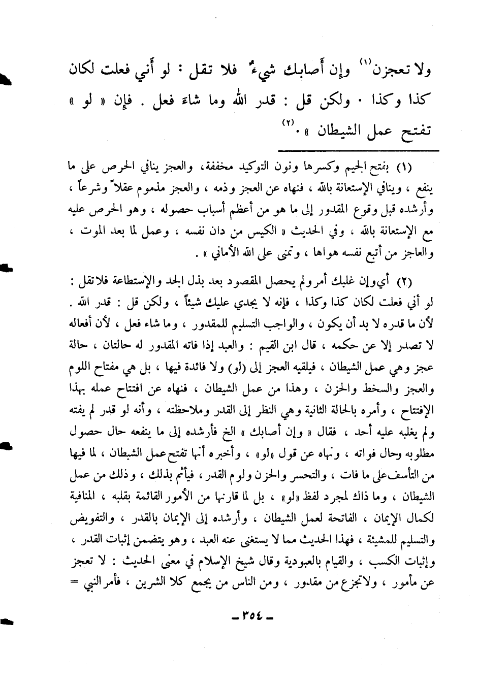 ولا تعجزن (1) ، وإن أصابك شيء فلا تقل: لو أني فعلت لكان كذا وكذا. ولكن قل: قدر الله وما شاء فعل. فإن " لو " تفتح عمل الشيطان " 1 (2) .