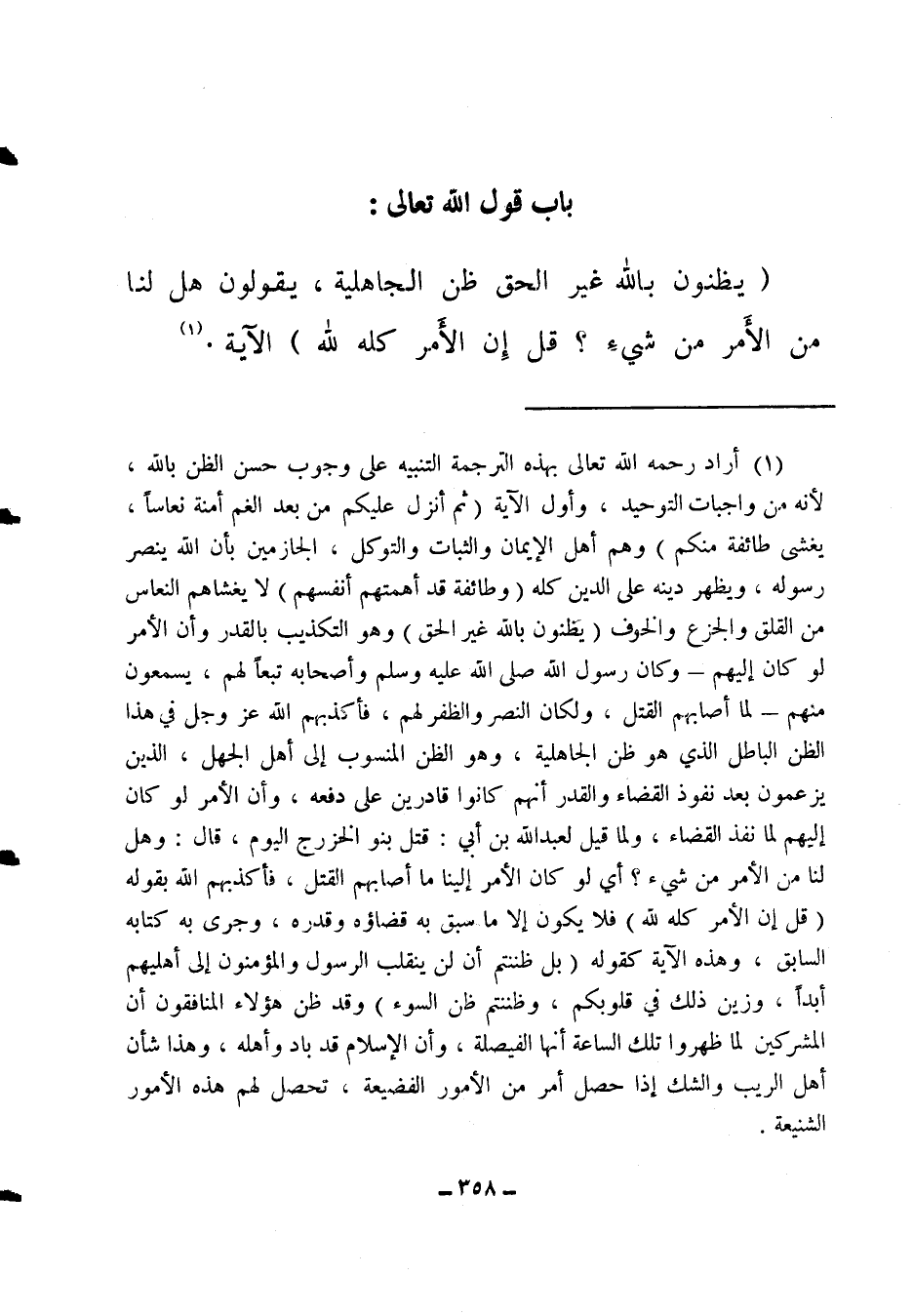 باب قول الله تعالى: {يظُنُّونَ بِاللَّهِ غَيْرَ الْحَقِّ ظَنَّ الْجَاهِلِيَّةِ يَقُولُونَ هَلْ لَنَا مِنَ الأَمْرِ مِنْ شَيْءٍ قُلْ إِنَّ الْأَمْرَ كُلَّهُ لِلَّهِ} 1 الآية.