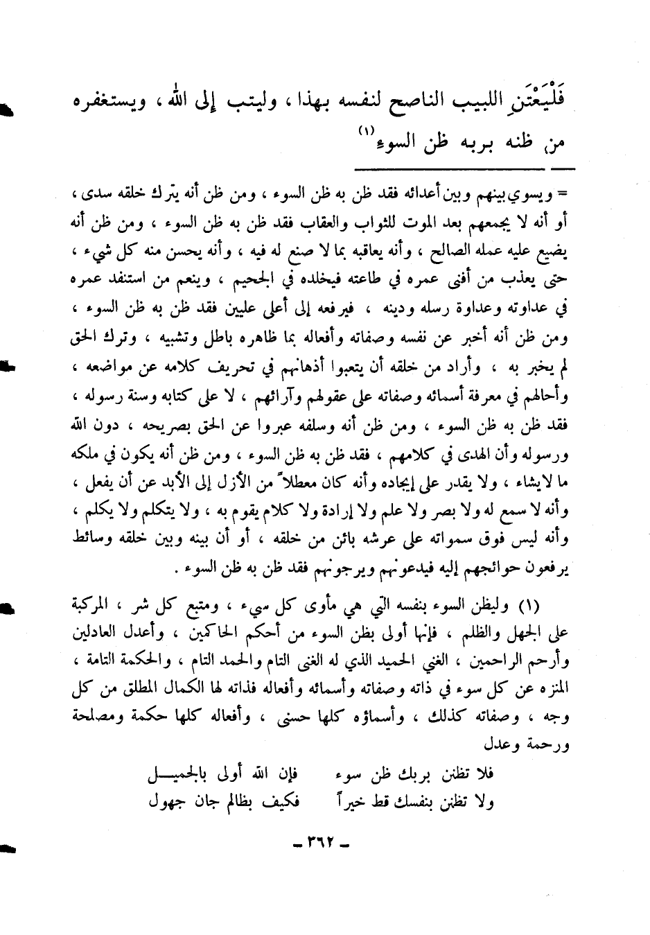 (1) وليظن السوء بنفسه التي هي مأوى كل سيئ، ومتبع كل شر، المركبة على الجهل والظلم، فإنها أولى بظن السوء من أحكم الحاكمين، وأعدل العادلين وأرحم الراحمين، الغني الحميد الذي له الغنى التام والحمد التام، والحكمة التامة، المنزه عن كل سوء في ذاته وصفاته وأسمائه وأفعاله، فذاته لها الكمال المطلق من كل وجه، وصفاته كذلك، وأسماؤه كلها حسنى، وأفعاله كلها حكمة ومصلحة ورحمة وعدل: