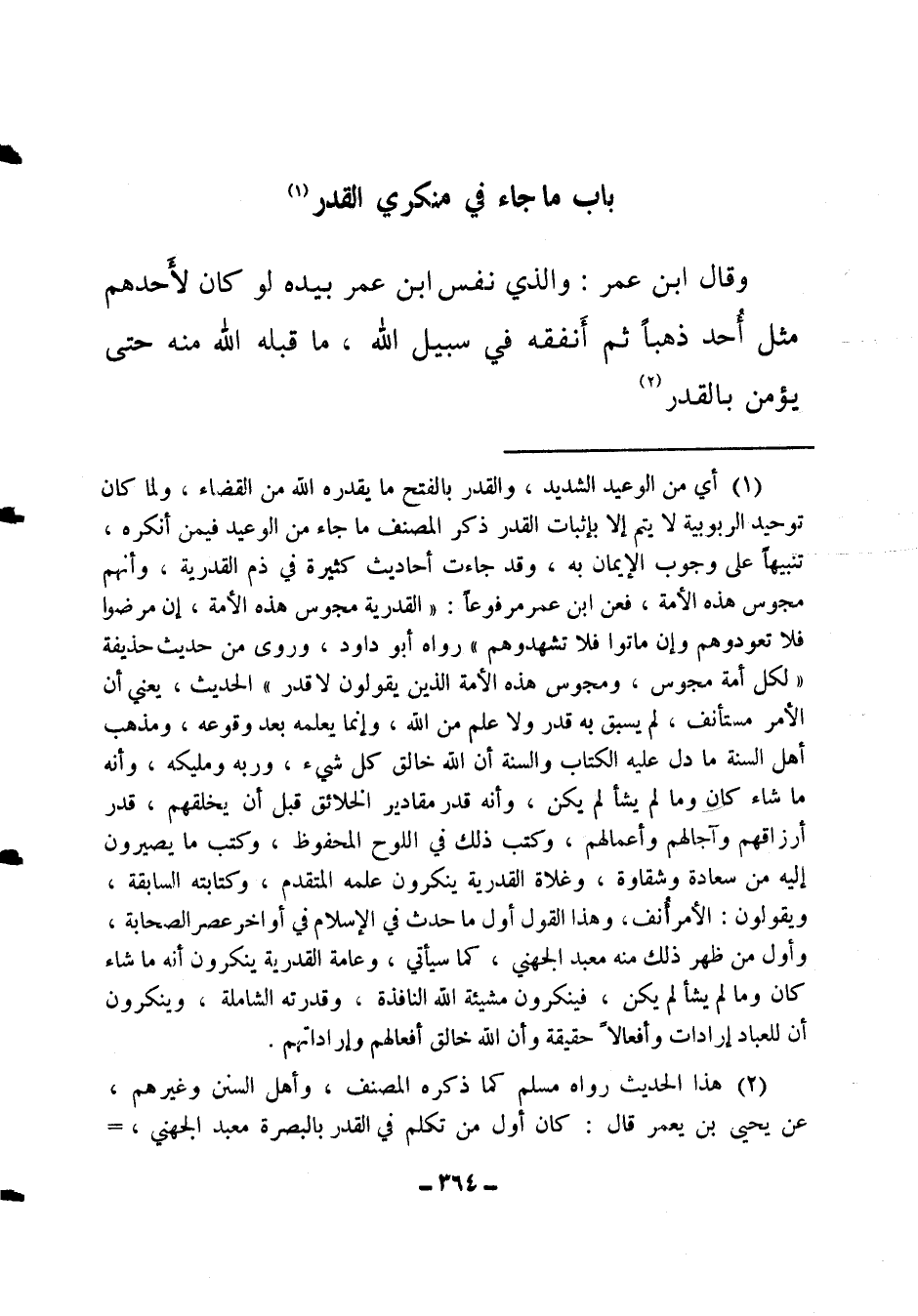 (2) هذا الحديث رواه مسلم كما ذكره المصنف، وأهل السنن وغيرهم عن يحيى بن يعمر قال: كان أول من تكلم في القدر بالبصرة معبد الجهني، =