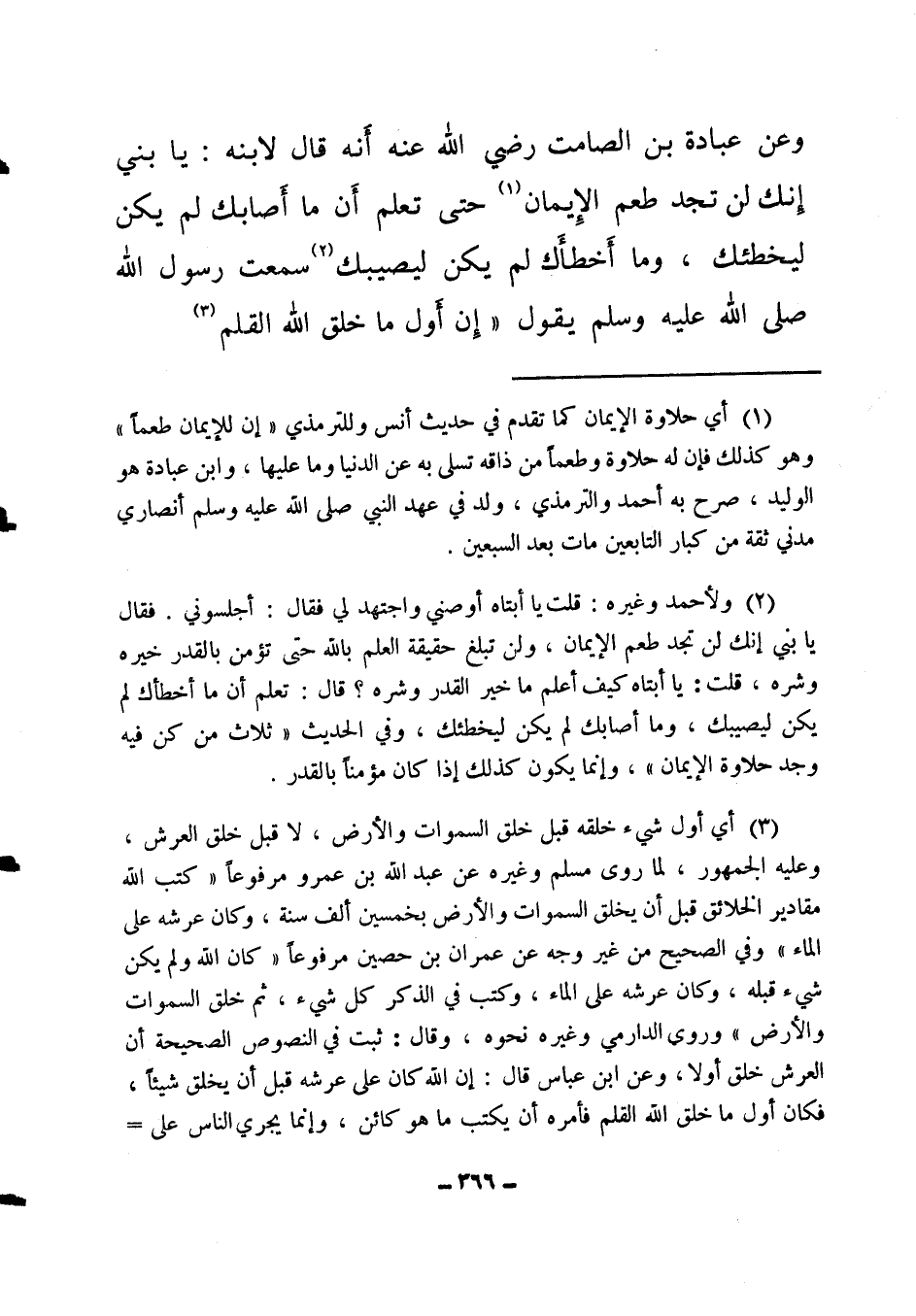 وعن عبادة بن الصامت رضي الله عنه أنه قال لابنه: يا بني إنك لن تجد طعم الإيمان (1) حتى تعلم أن ما أصابك لم يكن ليخطئك، وما أخطأك لم يكن ليصيبك (2) ، سمعت رسول الله صلى الله عليه وسلم يقول: " إن أول ما خلق الله القلم (3) ،