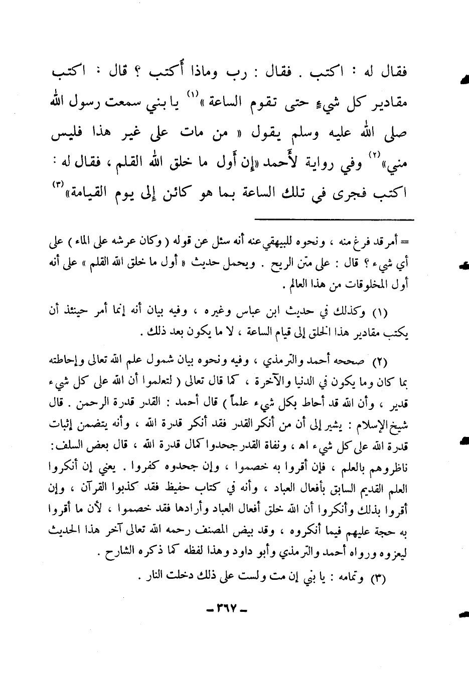 فقال له: اكتب. فقال: رب وماذا أكتب؟ قال: اكتب مقادير كل شيء حتى تقوم الساعة " 1 (1) . يا بني سمعت رسول الله صلى الله عليه وسلم يقول: " من مات على غير هذا فليس مني "2. (2) وفي رواية لأحمد: " إن أول ما خلق الله القلم، فقال له: اكتب فجرى في تلك الساعة ما هو كائن إلى يوم القيامة " 3 (3) .