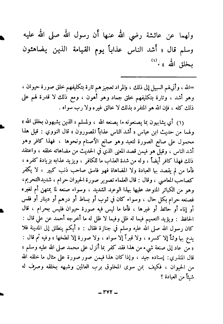 ولهما عن عائشة - رضي الله عنها - أن رسول الله صلى الله عليه وسلم قال: " أشد الناس عذابا يوم القيامة الذين يضاهئون بخلق الله " 1 (1) .