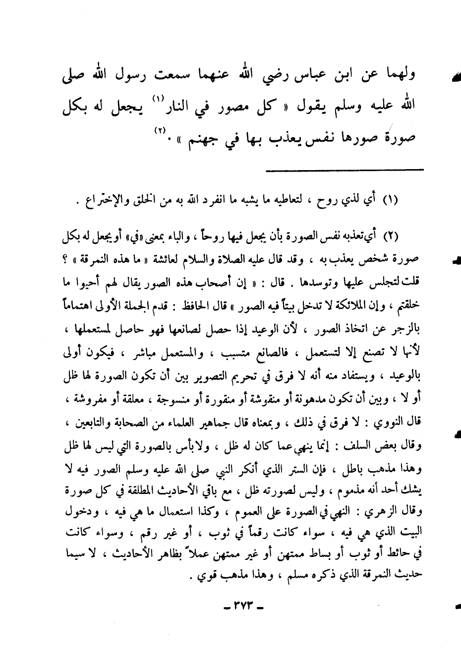 (2) أي تعذبه نفس الصورة بأن يجعل فيها روحا، والباء بمعنى " في " أو يجعل له بكل صورة شخص يعذب به، وقد قال - عليه الصلاة والسلام – لعائشة: " ما هذه النمرقة؟ قلت: لتجلس عليها وتوسدها. قال: إن أصحاب هذه الصور يقال لهم: أحيوا ما خلقتم، وإن الملائكة لا تدخل بيتا فيه الصور "2. قال الحافظ: قدم الجملة الأولى اهتماما بالزجر عن اتخاذ الصور؛ لأن الوعيد إذا حصل لصانعها فهو حاصل لمستعملها؛ لأنها لا تصنع إلا لتستعمل، فالصانع متسبب، والمستعمل مباشر، فيكون أولى بالوعيد، ويستفاد منه أنه لا فرق في تحريم التصوير بين أن تكون الصورة لها ظل أو لا، وبين أن تكون مدهونة أو منقوشة أو منقورة أو منسوجة، معلقة أو مفروشة. قال النووي: لا فرق في ذلك، وبمعناه قال جماهير العلماء من الصحابة والتابعين. وقال بعض السلف: إنما ينهى عما كان له ظل، ولا بأس بالصورة التي ليس لها ظل وهذا مذهب باطل، فإن الستر الذي أنكر النبي صلى الله عليه وسلم الصور فيه لا يشك أحد أنه مذموم، وليس لصورته ظل، مع باقي الأحاديث المطلقة في كل صورة. وقال الزهري: النهي في الصورة على العموم، وكذا استعمال ما هي فيه، ودخول البيت الذي هي فيه، سواء كانت رقما في ثوب، أو غير رقم، وسواء كانت في حائط أو ثوب أو بساط ممتهن أو غير ممتهن عملا بظاهر الأحاديث، لا سيما حديث النمرقة الذي ذكره مسلم، وهذا مذهب قوي.