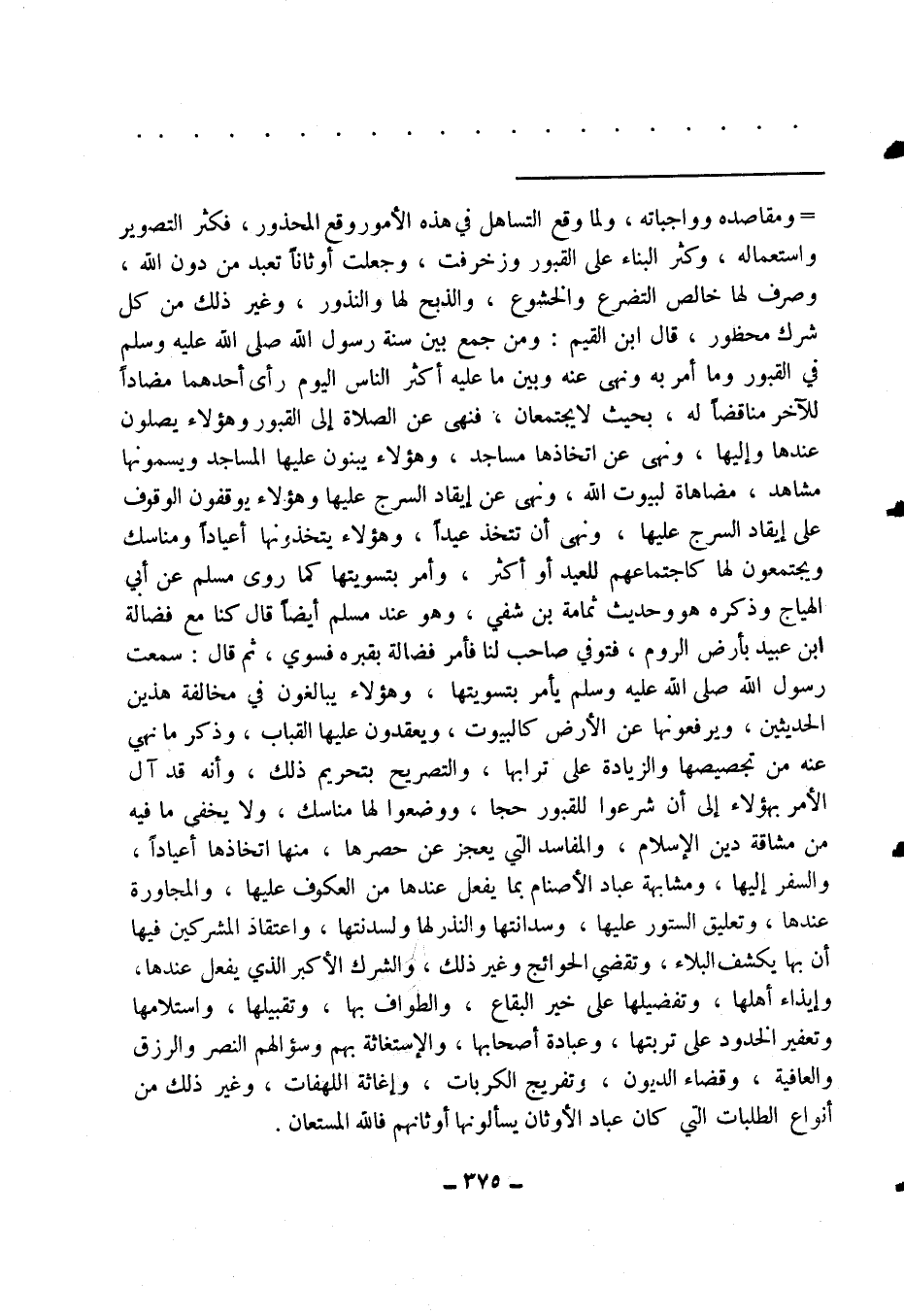 = ومقاصده وواجباته، ولما وقع التساهل في هذه الأمور وقع المحذور، فكثر التصوير واستعماله، وكثر البناء على القبور وزخرفت، وجعلت أوثانا تعبد من دون الله، وصرف لها خالص التضرع والخشوع، والذبح لها والنذور، وغير ذلك من كل شرك محظور. قال ابن القيم: ومن جمع بين سنة رسول الله صلى الله عليه وسلم في القبور وما أمر به ونهى عنه وبين ما عليه أكثر الناس اليوم رأى أحدهما مضادا للآخر مناقضا له، بحيث لا يجتمعان، فنهى عن الصلاة إلى القبور وهؤلاء يصلون عندها وإليها، ونهى عن اتخاذها مساجد، وهؤلاء يبنون عليها المساجد ويسمونها مشاهد، مضاهاة لبيوت الله، ونهى عن إيقاد السرج عليها وهؤلاء يوقفون الوقوف على إيقاد السرج عليها، ونهى أن تتخذ عيدا، وهؤلاء يتخذونها أعيادا ومناسك ويجتمعون لها كاجتماعهم للعيد أو أكثر، وأمر بتسويتها كما روى مسلم عن أبي الهياج وذكره هو وحديث ثمامة بن شفي، وهو عند مسلم أيضا قال: كنا مع فضالة بن عبيد بأرض الروم، فتوفي صاحب لنا فأمر فضالة بقبره فسوي، ثم قال: سمعت رسول الله صلى الله عليه وسلم يأمر بتسويتها. وهؤلاء يبالغون في مخالفة هذين الحديثين، ويرفعونها عن الأرض كالبيوت، ويعقدون عليها القباب، وذكر ما نهي عنه من تجصيصها والزيادة على ترابها، والتصريح بتحريم ذلك، وأنه قد آل الأمر بهؤلاء إلى أن شرعوا للقبور حجا، ووضعوا لها مناسك، ولا يخفى ما فيه من مشاقة دين الإسلام، والمفاسد التي يعجز عن حصرها، منها اتخاذها أعيادا، والسفر إليها، ومشابهة عباد الأصنام بما يفعل عندها من العكوف عليها، والمجاورة عندها، وتعليق الستور عليها، وسدانتها والنذر لها ولسدنتها، واعتقاد المشركين فيها أن بها يكشف البلاء، وتقضى الحوائج وغير ذلك، والشرك الأكبر الذي يفعل عندها، وإيذاء أهلها، وتفضيلها على خير البقاع، والطواف بها، وتقبيلها، واستلامها وتعفير الخدود على تربتها، وعبادة أصحابها، والاستغاثة بهم وسؤالهم النصر والرزق والعافية، وقضاء الديون، وتفريج الكربات، وإغاثة اللهفان، وغير ذلك من أنواع الطلبات التي كان عباد الأوثان يسألونها أوثانهم فالله المستعان.