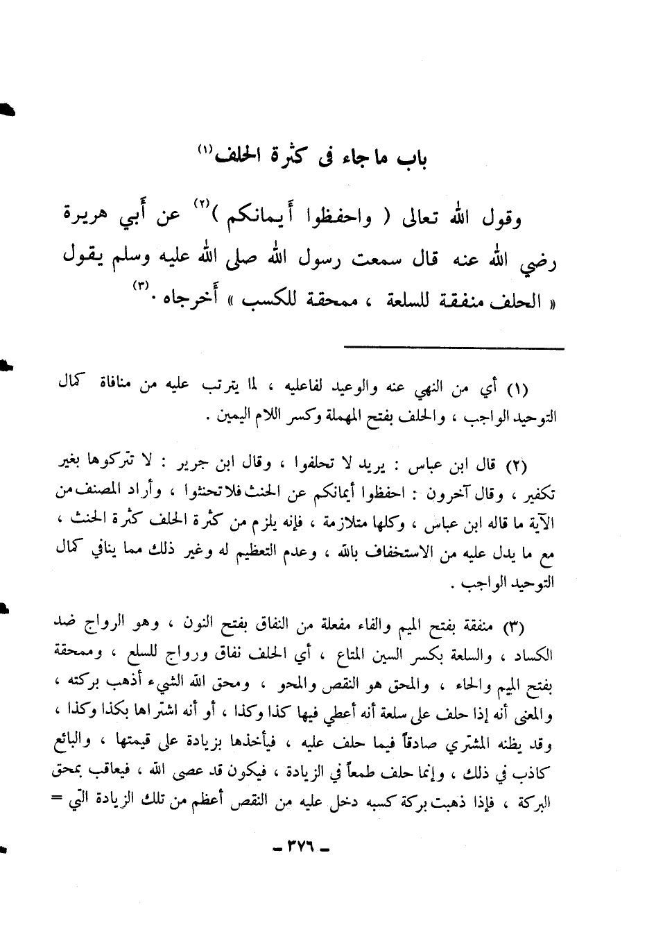 وقول الله تعالى: {وَاحْفَظُوا أَيْمَانَكُمْ} 1 (2) . عن أبي هريرة رضي الله عنه قال: سمعت رسول الله صلى الله عليه وسلم يقول: " الحلف منفقة للسلعة، ممحقة للكسب " 2. أخرجاه (3) .
