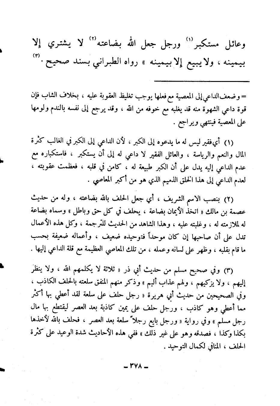 (3) وفي صحيح مسلم من حديث أبي ذر: " ثلاثة لا يكلمهم الله، ولا ينظر إليهم، ولا يزكيهم، ولهم عذاب أليم "2. وذكر منهم المنفق سلعته بالحلف الكاذب. وفي الصحيحين من حديث أبي هريرة: " رجل حلف على سلعة لقد أعطي بها أكثر مما أعطي وهو كاذب، ورجل حلف على يمين كاذبة بعد العصر ليقتطع بها مال رجل مسلم "3. وفي رواية: " ورجل بايع رجلا سلعة بعد العصر، فحلف بالله لأخذها بكذا وكذا، فصدقه وهو على غير ذلك " 4. ففي هذه الأحاديث شدة الوعيد على كثرة الحلف، المنافي لكمال التوحيد.
