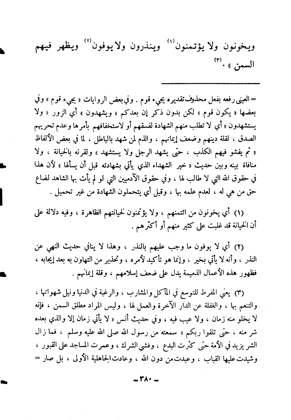 ويخونون ولا يؤتمنون (1) ، وينذرون ولا يوفون (2) ، ويظهر فيهم السمن "1 (3) .