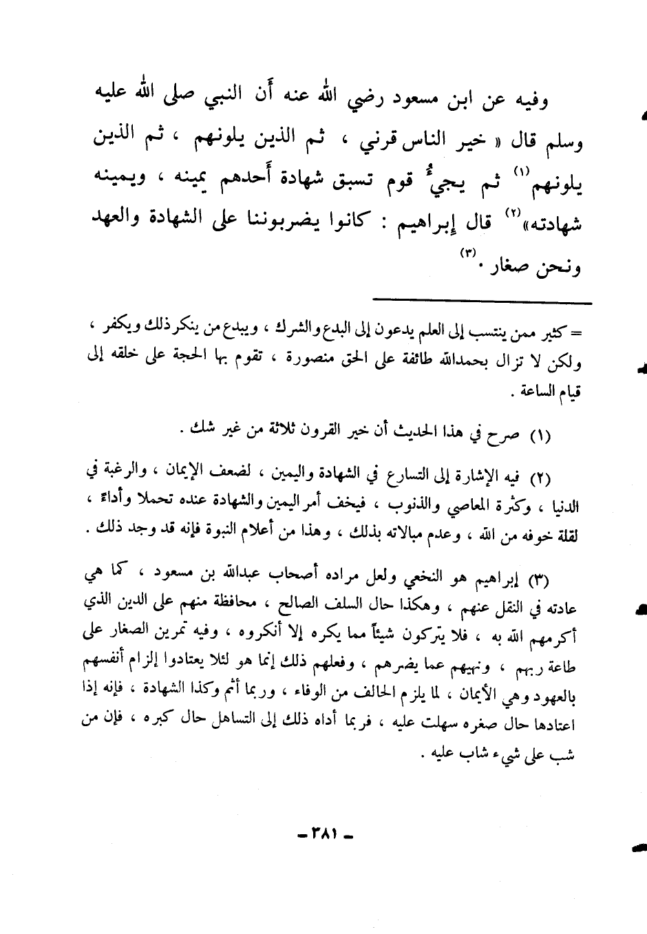 وفيه عن ابن مسعود رضي الله عنه أن النبي صلى الله عليه وسلم قال: " خير الناس قرني، ثم الذين يلونهم (1) ، ثم الذين يلونهم، ثم يجيء قوم تسبق شهادة أحدهم يمينه، ويمينه شهادته "1 (2) . قال إبراهيم: ((كانوا يضربوننا على الشهادة والعهد ونحن صغار)) (3) .