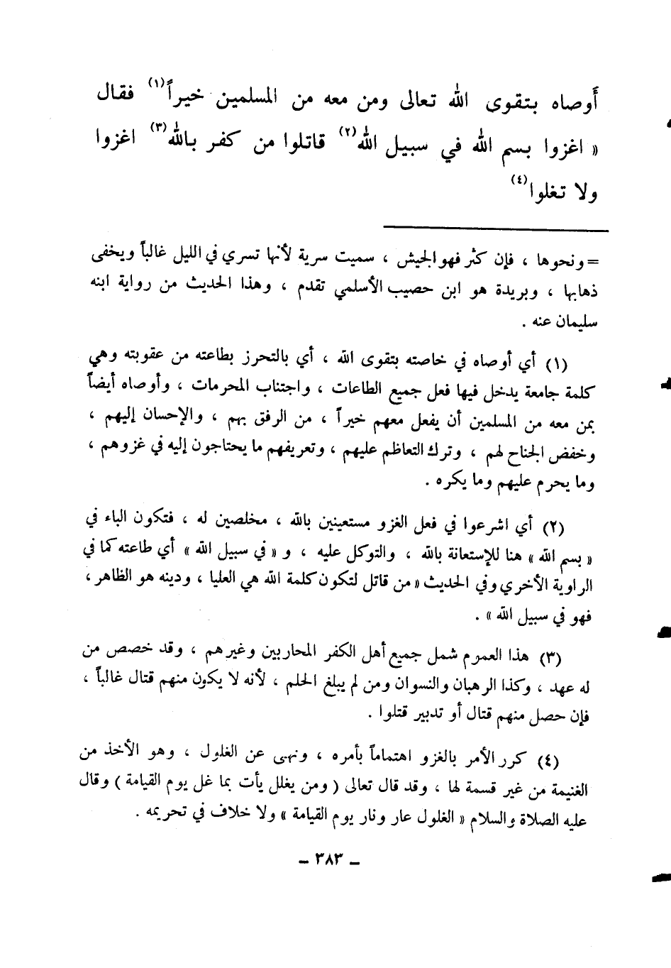 (1) أي أوصاه في خاصته بتقوى الله، أي بالتحرز بطاعته من عقوبته، وهي كلمة جامعة يدخل فيها فعل جميع الطاعات، واجتناب المحرمات، وأوصاه أيضا بمن معه من المسلمين أن يفعل معهم خيرا من الرفق بهم، والإحسان إليهم، وخفض الجناح لهم، وترك التعاظم عليهم، وتعريفهم ما يحتاجون إليه في غزوهم، وما يحرم عليهم وما يكره.