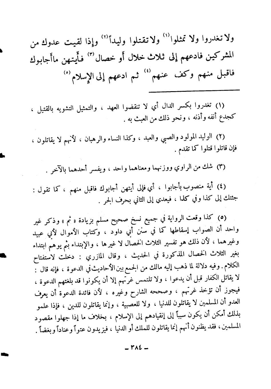 ولا تغدروا، ولا تمثلوا (1) ، ولا تقتلوا وليدا (2) ، وإذا لقيت عدوك من المشركين فادعهم إلى ثلاث خلال - أو خصال - (3) : فأيتهن ما أجابوك فاقبل منهم وكف عنهم (4) ، ثم ادعهم إلى الإسلام (5) ،