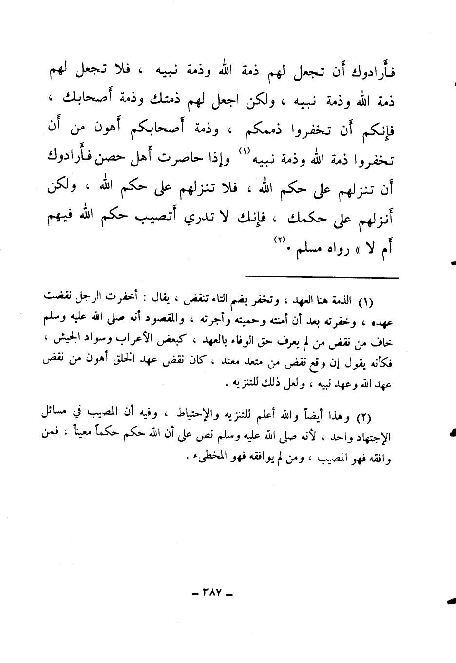 فأرادوك أن تجعل لهم ذمة الله وذمة نبيه، فلا تجعل لهم ذمة الله وذمة نبيه، ولكن اجعل لهم ذمتك وذمة أصحابك، فإنكم أن تخفروا ذممكم، وذمة أصحابكم أهون من أن تخفروا ذمة الله وذمة نبيه (1) ، وإذا حاصرت أهل حصن فأرادوك أن تنزلهم على حكم الله، فلا تنزلهم على حكم الله، ولكن أنزلهم على حكمك، فإنك لا تدري أتصيب حكم الله فيهم أم لا " رواه مسلم (2) .