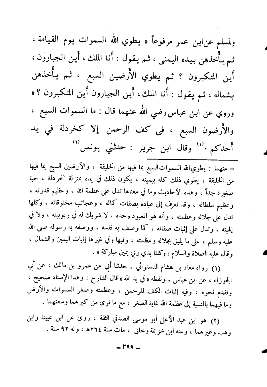 (1) رواه معاذ بن هشام الدستوائي، حدثنا أبي عن عمرو بن مالك، عن أبي الجوزاء، عن ابن عباس، ولفظه: "في يد الله ". قال الشارح: وهذا الإسناد صحيح، وتقدم نحوه. وفيه إثبات الكف للرحمن، وعظمته وصغر السماوات والأرض وما فيهما بالنسبة إلى عظمة الله غاية الصغر، مع ما ترى من كبرهما وسعتهما.