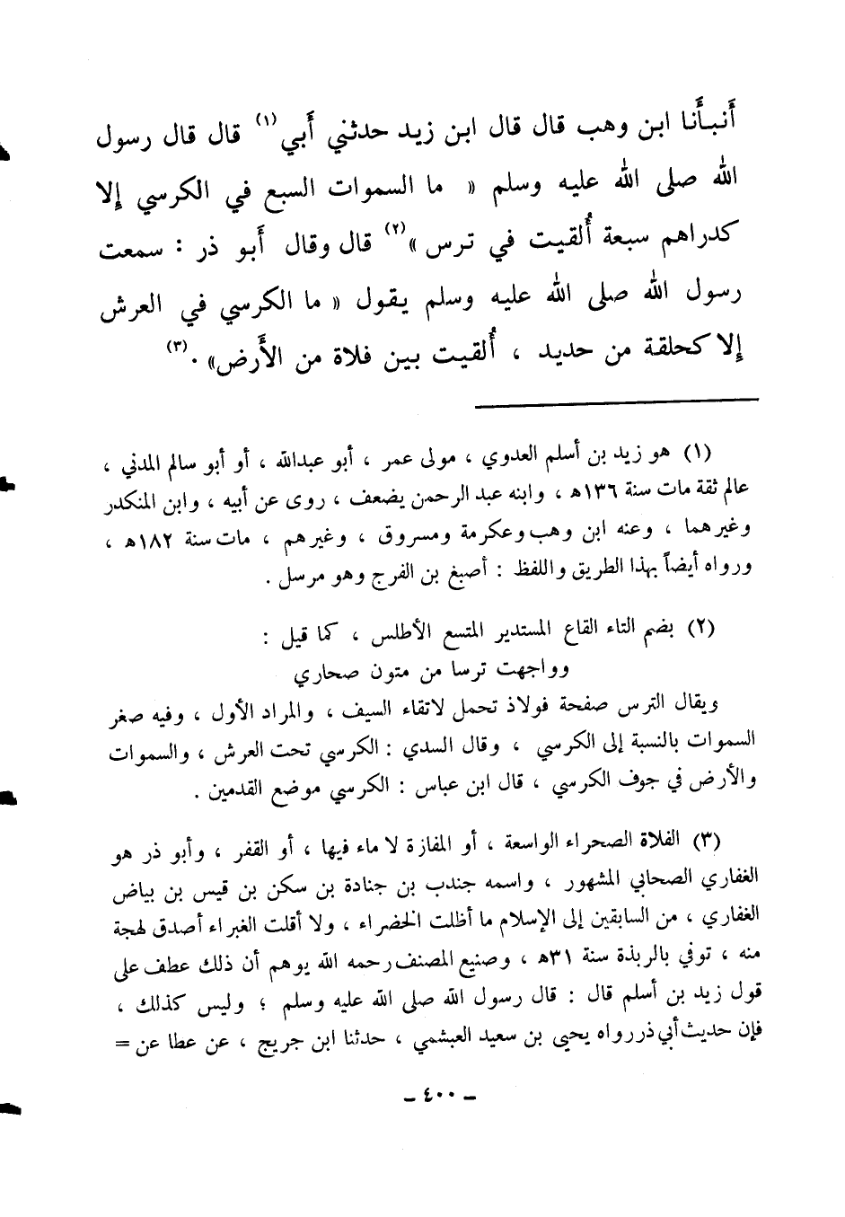 أنبأنا ابن وهب قال: قال ابن زيد: حدثني أبي (1) قال: قال رسول الله صلى الله عليه وسلم: " ما السماوات السبع في الكرسي إلا كدراهم سبعة ألقيت في ترس (2) ". قال: وقال أبو ذر: سمعت رسول الله صلى الله عليه وسلم يقول: " ما الكرسي في العرش إلا كحلقة من حديد، ألقيت بين فلاة من الأرض (3) ".