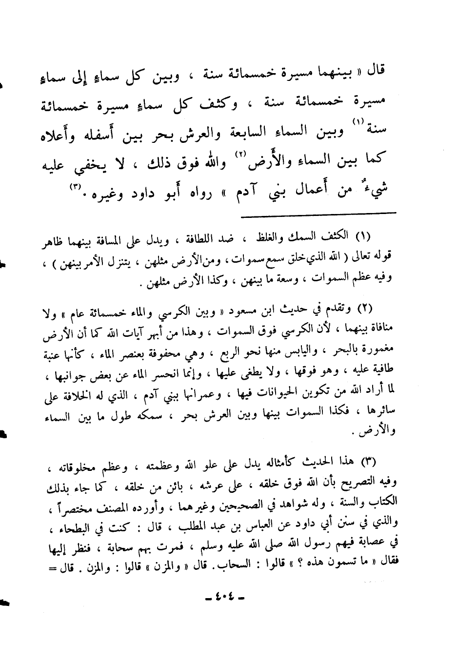 (2) وتقدم في حديث ابن مسعود: " وبين الكرسي والماء خمسمائة عام ". ولا منافاة بينهما؛ لأن الكرسي فوق السماوات، وهذا من أبهر آيات الله كما أن الأرض مغمورة بالبحر، واليابس منها نحو الربع، وهي محفوفة بعنصر الماء، كأنها عنبة طافية عليه، وهو فوقها ولا يطغى عليها، وإنما انحسر الماء عن بعض جوانبها، لما أراد الله من تكوين الحيوانات فيها، وعمرانها ببني آدم، الذي له الخلافة على سائرها، فكذا السماوات بينها وبين العرش بحر، سمكه طول ما بين السماء والأرض.