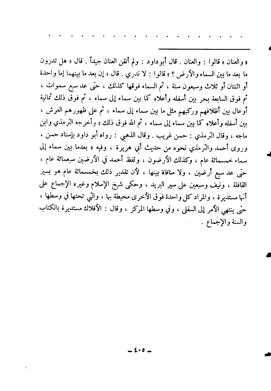 قال: " هل تدرون ما بعد ما بين السماء والأرض؟ قالوا: لا ندري. قال: إن بعد ما بينهما إما واحدة أو اثنتان أو ثلاث وسبعون سنة، ثم السماء فوقها كذلك، حتى عد سبع سماوات، ثم فوق السابعة بحر بين أسفله وأعلاه كما بين سماء إلى سماء، ثم فوق ذلك ثمانية أو عال بين أظلافهم وركبهم مثل ما بين سماء إلى سماء، ثم على ظهورهم العرش، بين أسفله وأعلاه كما بين سماء إلى سماء، ثم الله فوق ذلك "2. أخرجه الترمذي وابن ماجه، وقال الترمذي: حسن غريب. وقال الذهبي: رواه أبو داود بإسناد حسن، وروى أحمد والترمذي نحوه من حديث أبي هريرة، وفيه: " بعد ما بين سماء إلى سماء خمسمائة عام، وكذلك الأرضون ". ولفظ أحمد في الأرضين سبعمائة عام، حتى عد سبع أرضين، ولا منافاة بينها؛ لأن تقدير ذلك بخمسمائة عام هو بسير القافلة، ونيف وسبعين على سير البريد، وحكى شيخ الإسلام وغيره الإجماع على أنها مستديرة، والمراد كل واحدة فوق الأخرى محيطة بها، والتي تحتها في وسطها، حتى ينتهي الأمر إلى السفلى، وفي وسطها المركز، وقال: الأفلاك مستديرة بالكتاب والسنة والإجماع.