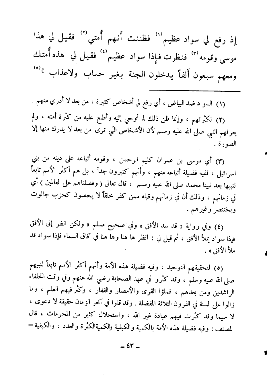 إذ رفع لي سواد عظيم (1) فظننت أنهم أمتي (2) ، فقيل لي: هذا موسى وقومه (3) ، فنظرت فإذا سواد عظيم (4) فقيل لي: هذه أمتك ومعهم سبعون ألفا يدخلون الجنة بغير حساب ولا عذاب (5) " 1.
