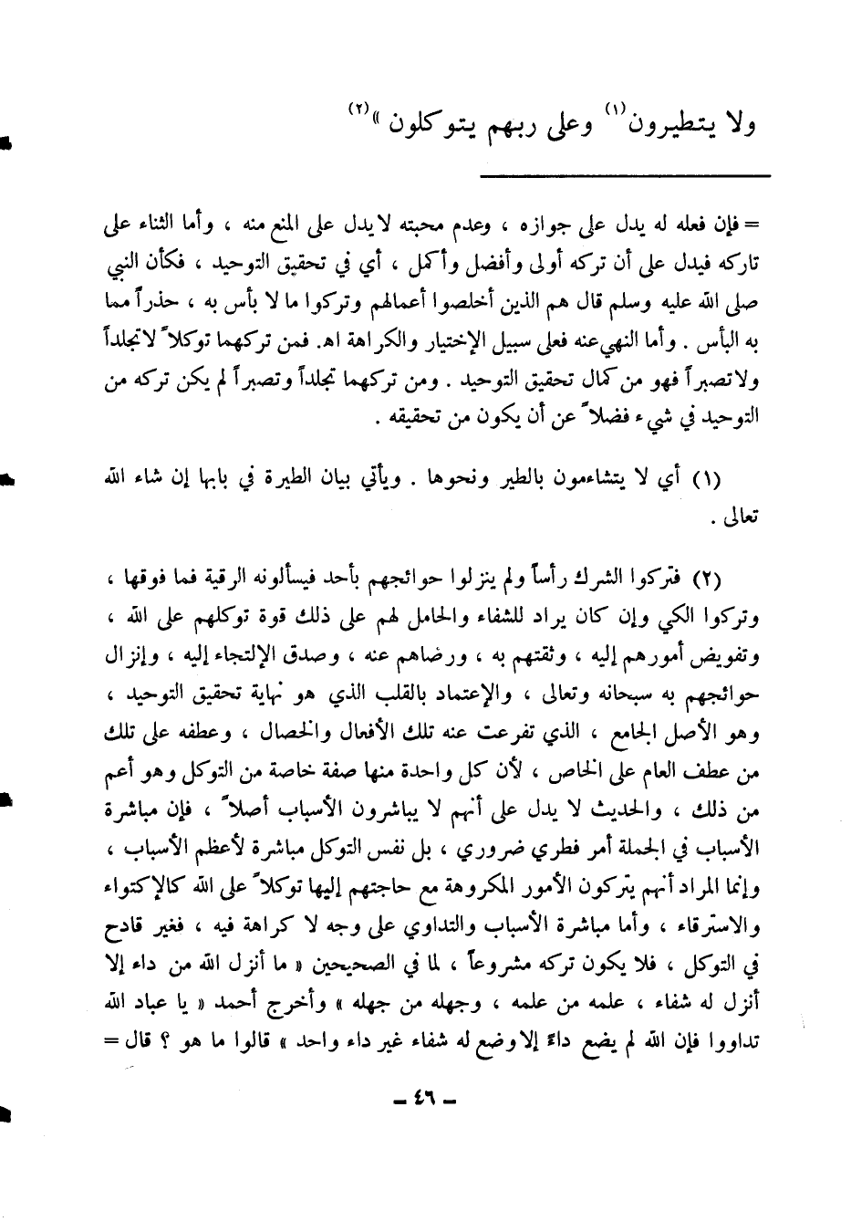 (1) أي لا يتشاءمون بالطير ونحوها. ويأتي بيان الطيرة في بابها إن شاء الله تعالى.