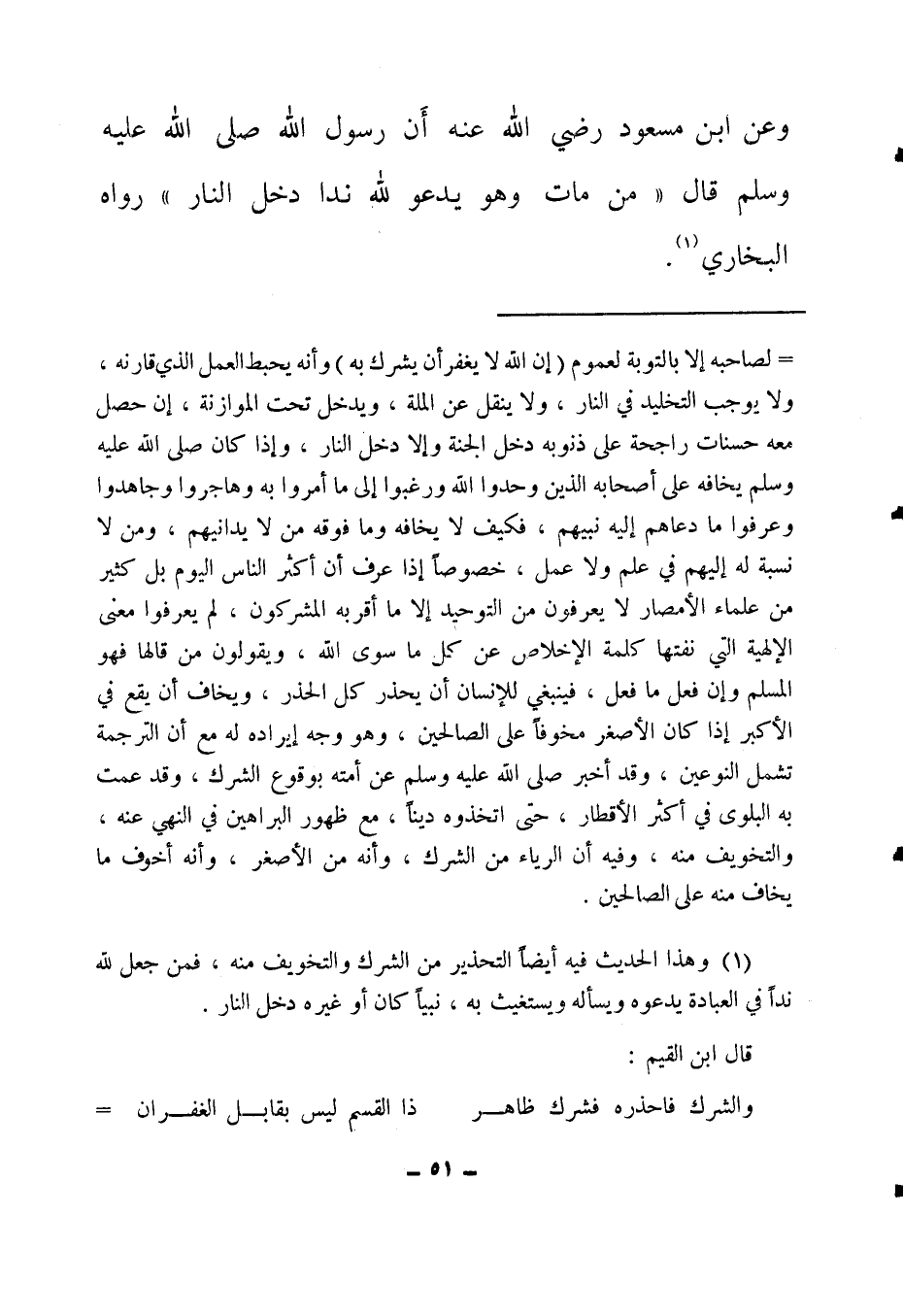 = لصاحبه أبدا إلا بالتوبة، وأنه يحبط جميع الأعمال، وأن صاحبه خالد مخلد في النار. والأصغر: هو ما أتي في النصوص أنه شرك، ولم يصل إلى حد الشرك الأكبر، وحكمه أنه لا يغفر لصاحبه إلا بالتوبة لعموم {إِنَّ اللَّهَ لا يَغْفِرُ أَنْ يُشْرَكَ بِهِ} 2، وأنه يحبط العمل الذي قارنه، ولا يوجب التخليد في النار، ولا ينقل عن الملة، ويدخل تحت الموازنة، إن حصل معه حسنات راجحة على ذنوبه دخل الجنة وإلا دخل النار، وإذا كان صلى الله عليه وسلم يخافه على أصحابه الذين وحدوا الله ورغبوا إلى ما أمروا به، وهاجروا وجاهدوا وعرفوا ما دعاهم إليه نبيهم، فكيف لا يخافه وما فوقه من لا يدانيهم، ومن لا نسبة له إليهم في علم ولا عمل؟ خصوصا إذا عرف أن أكثر الناس اليوم بل كثير من علماء الأمصار لا يعرفون من التوحيد إلا ما أقر به المشركون، لم يعرفوا معنى الإلهية التي نفتها كلمة الإخلاص عن كل ما سوى الله، ويقولون: من قالها فهو المسلم وإن فعل ما فعل.