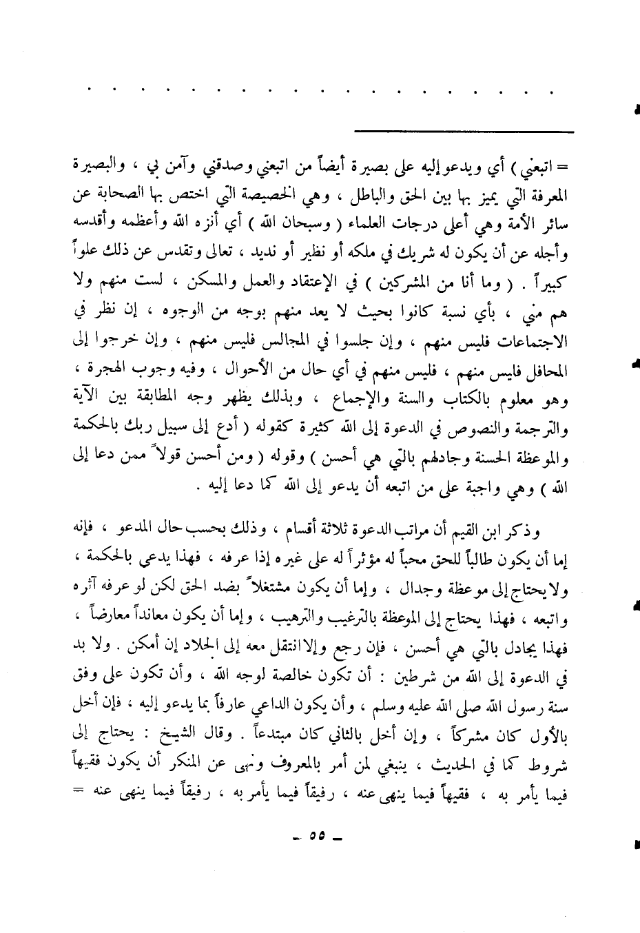 = اتبعني) أي ويدعو إليه على بصيرة أيضا من اتبعني وصدقني وآمن بي، والبصيرة المعرفة التي يميز بها بين الحق والباطل، وهي الخصيصة التي اختص بها الصحابة عن سائر الأمة وهي أعلى درجات العلماء. (وسبحان الله) أي أنزه الله وأعظمه وأقدسه وأجله عن أن يكون له شريك في ملكه أو نظير أو نديد، تعالى وتقدس عن ذلك علوا كبيرا. {وَمَا أَنَا مِنَ الْمُشْرِكِينَ} 1 في الاعتقاد والعمل والمسكن، لست منهم ولا هم مني، بأي نسبة كانوا بحيث لا يعد منهم بوجه من الوجوه، إن نظر في الاجتماعات فليس منهم، وإن جلسوا في المجالس فليس منهم، وإن خرجوا إلى المحافل فليس منهم، فليس منهم في أي حال من الأحوال، وفيه وجوب الهجرة، وهو معلوم بالكتاب والسنة والإجماع، وبذلك يظهر وجه المطابقة بين الآية والترجمة. والنصوص في الدعوة إلى الله كثيرة كقوله: {ادْعُ إِلَى سَبِيلِ رَبِّكَ بِالْحِكْمَةِ وَالْمَوْعِظَةِ الْحَسَنَةِ وَجَادِلْهُمْ بِالَّتِي هِيَ أَحْسَنُ} 2. وقوله: {وَمَنْ أَحْسَنُ قَوْلاً مِمَّنْ دَعَا إِلَى اللَّهِ} 3. وهي واجبة على من اتبعه أن يدعو إلى الله كما دعا إليه. وذكر ابن القيم أن مراتب الدعوة ثلاثة أقسام: وذلك بحسب حال المدعو، فإنه إما أن يكون طالبا للحق محبا له مؤثرا له على غيره إذا عرفه، فهذا يدعى بالحكمة، ولا يحتاج إلى موعظة وجدال، وإما أن يكون مشتغلا بضد الحق لكن لو عرفه آثره واتبعه، فهذا يحتاج إلى الموعظة بالترغيب والترهيب، وإما أن يكون معاندا معارضا، فهذا يجادل بالتي هي أحسن، فإن رجع وإلا انتقل معه إلى الجلاد إن أمكن.