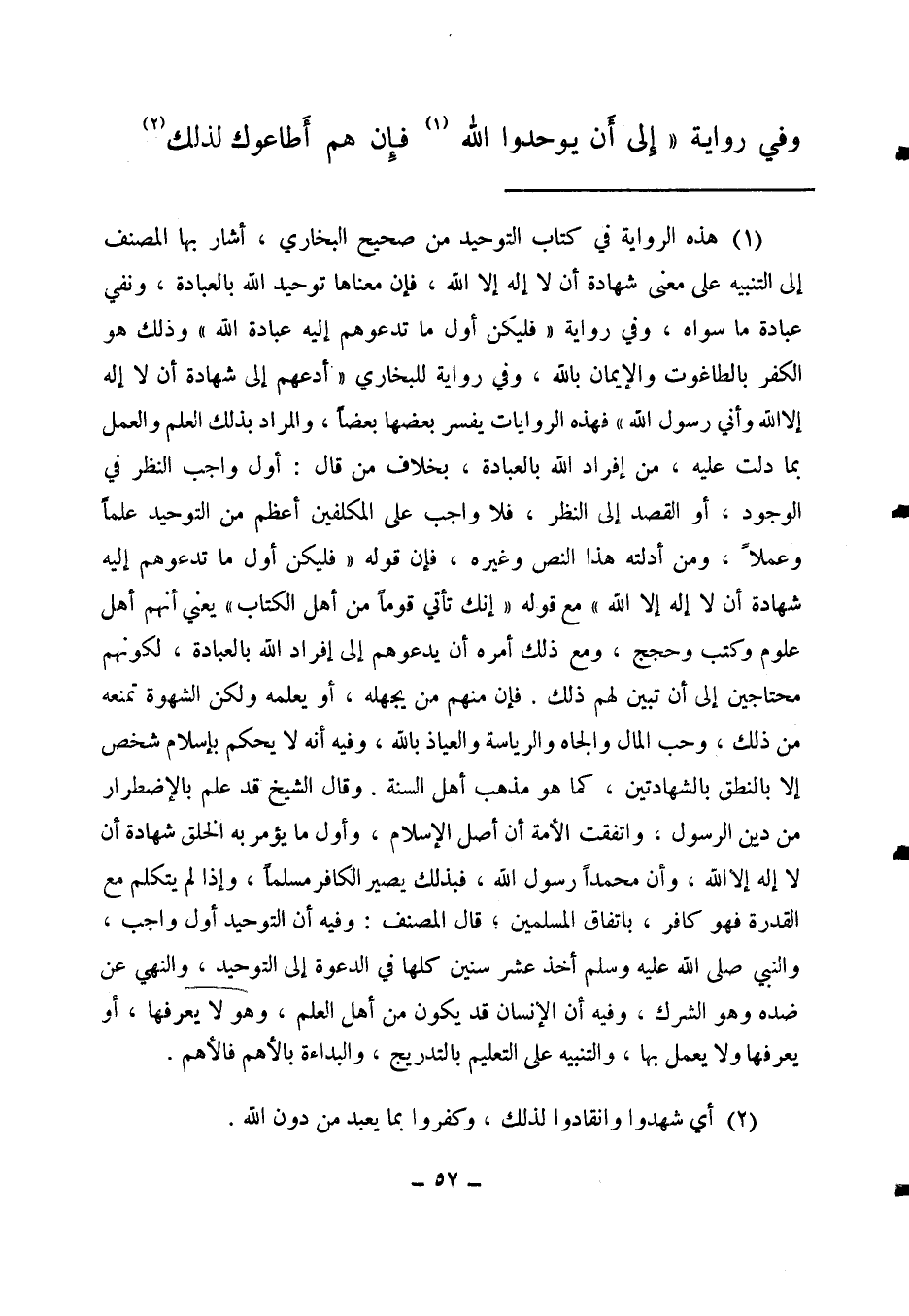 (1) هذه الرواية في كتاب التوحيد من صحيح البخاري، أشار بها المصنف إلى التنبيه على معنى شهادة ألا إله إلا الله، فإن معناها توحيد الله بالعبادة ونفي عبادة ما سواه، وفي رواية: " فليكن أول ما تدعوهم إليه عبادة الله " 1، وذلك هو الكفر بالطاغوت والإيمان بالله، وفي رواية للبخاري: " أدعهم إلى شهادة ألا إله إلا الله وأني رسول الله " 2، فهذه الروايات يفسر بعضها بعضا، والمراد بذلك العلم والعمل بما دلت عليه، من إفراد الله بالعبادة، بخلاف من قال: أول واجب النظر في الوجود، أو القصد إلى النظر، فلا واجب على المكلفين أعظم من التوحيد علما وعملا، ومن أدلته هذا النص وغيره؛ فإن قوله: " فليكن أول ما تدعوهم إليه شهادة ألا إله إلا الله " 3 مع قوله: "إنك تأتي قوما من أهل الكتاب" يعني أنهم أهل علوم وكتب وحجج، ومع ذلك أمره أن يدعوهم إلى إفراد الله بالعبادة، لكونهم محتاجين إلى أن تبين لهم ذلك، فإن منهم من يجهله، أو يعلمه ولكن الشهوة تمنعه من ذلك، وحب المال والجاه والرياسة والعياذ بالله، وفيه أنه لا يحكم بإسلام شخص إلا بالنطق بالشهادتين كما هو مذهب أهل السنة.