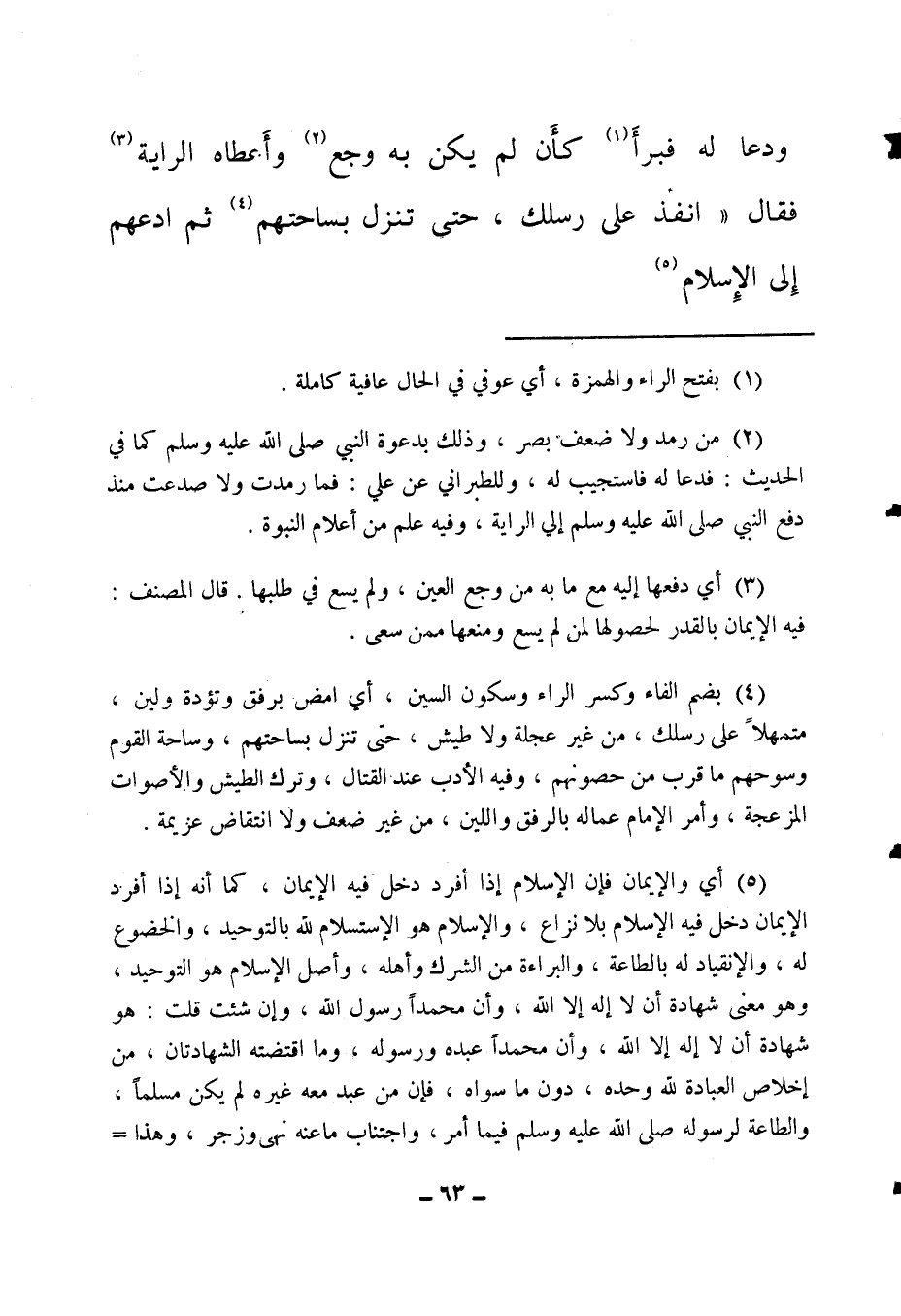 ودعا له فبرأ (1) كأن لم يكن به وجع (2) ، وأعطاه الراية (3) فقال: انفذ على رسلك، حتى تنزل بساحتهم (4) ، ثم ادعهم إلى الإسلام (5) ،