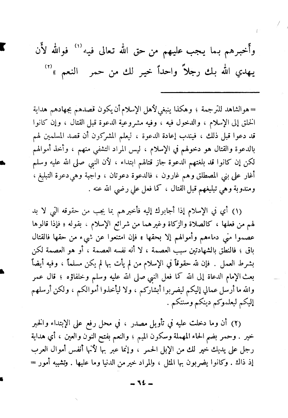 = هو الشاهد للترجمة. وهكذا ينبغي لأهل الإسلام أن يكون قصدهم بجهادهم هداية الخلق إلى الإسلام والدخول فيه، وفيه مشروعية الدعوة قبل القتال، وإن كانوا قد دعوا قبل ذلك، فيندب إعادة الدعوة؛ ليعلم المشركون أن قصد المسلمين لهم بالدعوة والقتال هو دخولهم في الإسلام، ليس المراد التشفي منهم وأخذ أموالهم، لكن إن كانوا قد بلغتهم الدعوة جاز قتالهم ابتداء؛ لأن النبي صلى الله عليه وسلم أغار على بني المصطلق وهم غارون. فالدعوة دعوتان: واجبة وهي دعوة التبليغ، ومندوبة وهي تبليغهم قبل القتال كما فعل علي رضي الله عنه.