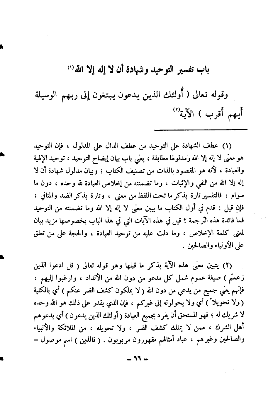 (1) عطف الشهادة على التوحيد من عطف الدال على المدلول؛ فإن التوحيد هو معنى لا إله إلا الله ومدلولها مطابقة، يعني باب بيان إيضاح التوحيد، توحيد الإلهية والعبادة؛ لأنه هو المقصود بالذات من تصنيف الكتاب، وبيان مدلول شهادة ألا إله إلا الله من النفي والإثبات، وما تضمنته من إخلاص العبادة لله وحده دون ما سواه، فالتفسير تارة بذكر ما تحت اللفظ من معنى، وتارة بذكر الضد والمنافي; فإن قيل: قدم في أول الكتاب ما يبين معنى لا إله إلا الله وما تضمنته من التوحيد، فما فائدة هذه الترجمة؟ قيل: في هذه الآيات التي في هذا الباب بخصوصها مزيد بيان لمعنى كلمة الإخلاص، وما دلت عليه من توحيد العبادة، والحجة على من تعلق على الأولياء والصالحين.