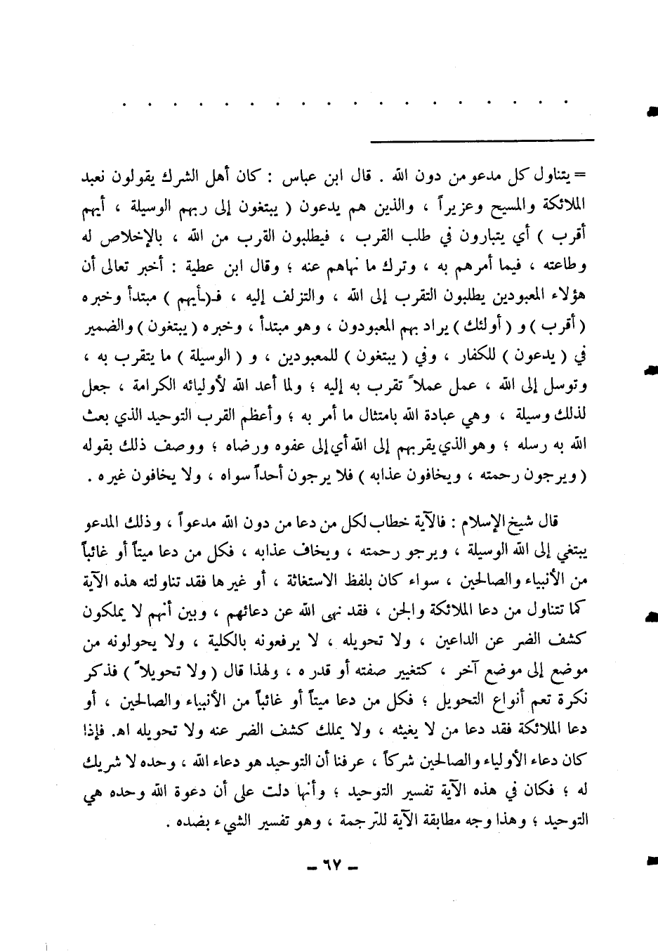 = يتناول كل مدعو من دون الله. قال ابن عباس: " كان أهل الشرك يقولون نعبد الملائكة والمسيح وعزيرا "، والذين هم يدعون: {يَبْتَغُونَ إِلَى رَبِّهِمُ الْوَسِيلَةَ أَيُّهُمْ أَقْرَبُ} 1 أي يتبارون في طلب القرب، فيطلبون القرب من الله بالإخلاص له، وطاعته فيما أمرهم به، وترك ما نهاهم عنه. وقال ابن عطية: أخبر تعالى أن هؤلاء المعبودين يطلبون التقرب إلى الله، والتزلف إليه، فـ (أيهم) مبتدأ وخبره (أقرب) و (أولئك) يراد بهم المعبودون، وهو مبتدأ، وخبره (يبتغون) ، والضمير في (يدعون) للكفار، وفي (يبتغون) للمعبودين، و (الوسيلة) ما يتقرب به، وتوسل إلى الله عمل عملا تقرب به إليه، ولما أعد الله لأوليائه الكرامة، جعل لذلك وسيلة، وهي عبادة الله بامتثال ما أمر به، وأعظم القرب التوحيد الذي بعث الله به رسله، وهو الذي يقربهم إلى الله أي إلى عفوه ورضاه، ووصف ذلك بقوله: {وَيَرْجُونَ رَحْمَتَهُ وَيَخَافُونَ عَذَابَهُ} 2 فلا يرجون أحدا سواه، ولا يخافون غيره. قال شيخ الإسلام: ((فالآية خطاب لكل من دعا من دون الله مدعوا، وذلك المدعو يبتغي إلى الله الوسيلة، ويرجو رحمته ويخاف عذابه، فكل من دعا ميتا أو غائبا من الأنبياء والصالحين، سواء كان بلفظ الاستغاثة أو غيرها، فقد تناولته هذه الآية كما تتناول من دعا الملائكة والجن، فقد نهى الله عن دعائهم، وبين أنهم لا يملكون كشف الضر عن الداعين ولا تحويله، لا يرفعونه بالكلية، ولا يحولونه من موضع إلى موضع آخر كتغيير صفته أو قدره، ولهذا قال: (ولا تحويلا) فذكر نكرة تعم أنواع التحويل، فكل من دعا ميتا أو غائبا من الأنبياء والصالحين، أو دعا الملائكة فقد دعا من لا يغيثه، ولا يملك كشف الضر عنه ولا تحويله)) اهـ.
