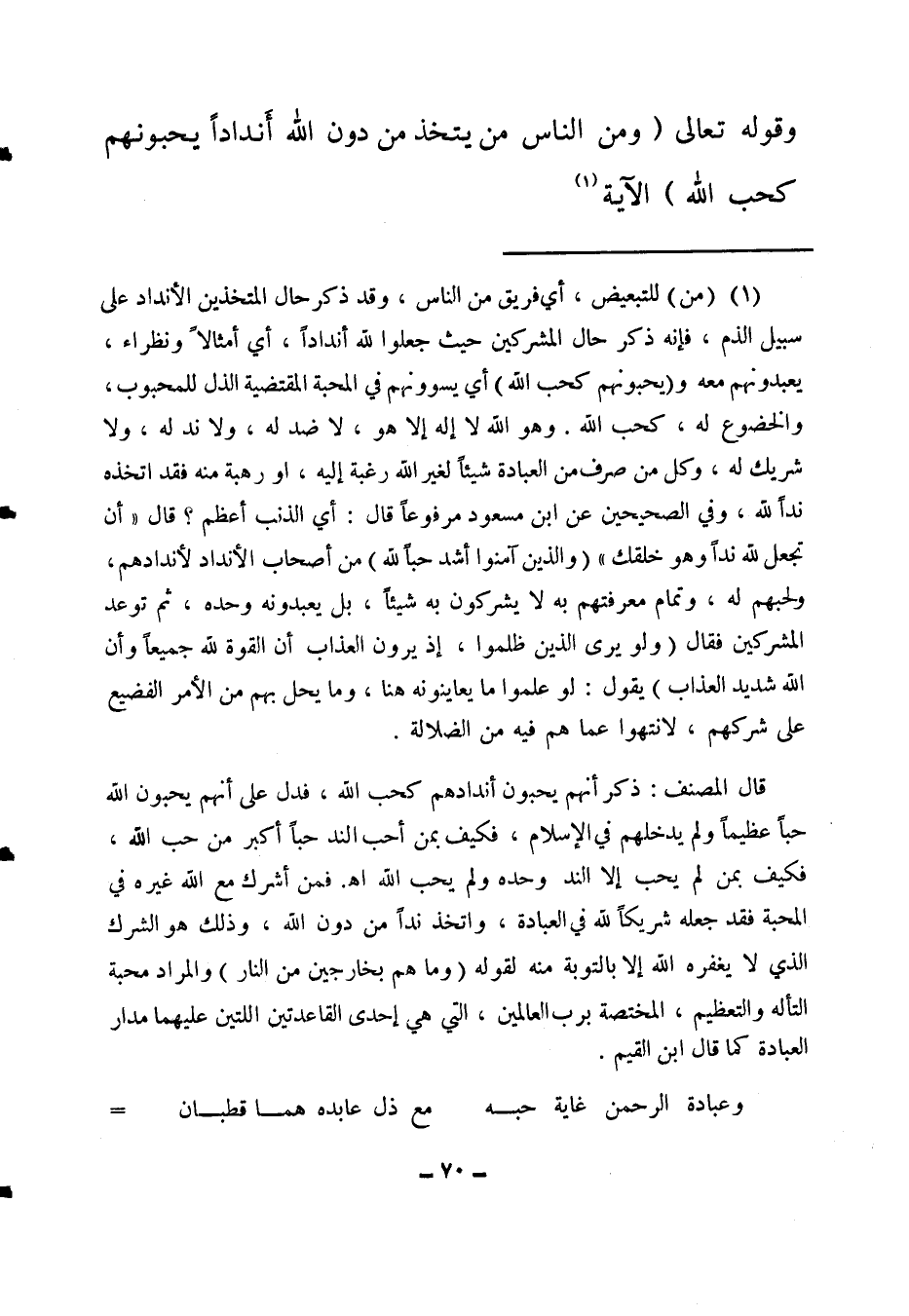 قال المصنف: ((ذكر أنهم يحبون أندادهم كحب الله، فدل على أنهم يحبون الله حبا عظيما ولم يدخلهم في الإسلام، فكيف بمن أحب الند حبا أكبر من حب الله؟ فكيف بمن لم يحب إلا الند وحده ولم يحب الله؟)) اهـ. فمن أشرك مع الله غيره في المحبة فقد جعله شريكا لله في العبادة، واتخذ ندا من دون الله، وذلك هو الشرك الذي لا يغفره الله إلا بالتوبة منه لقوله: {وَمَا هُمْ بِخَارِجِينَ مِنَ النَّارِ} 5 والمراد محبة التأله والتعظيم المختصة برب العالمين، التي هي إحدى القاعدتين اللتين عليهما مدار العبادة كما قال ابن القيم: