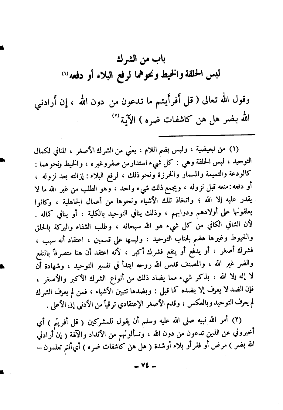 باب من الشرك لبس الحلقة والخيط ونحوهما لرفع البلاء أو دفعه 1