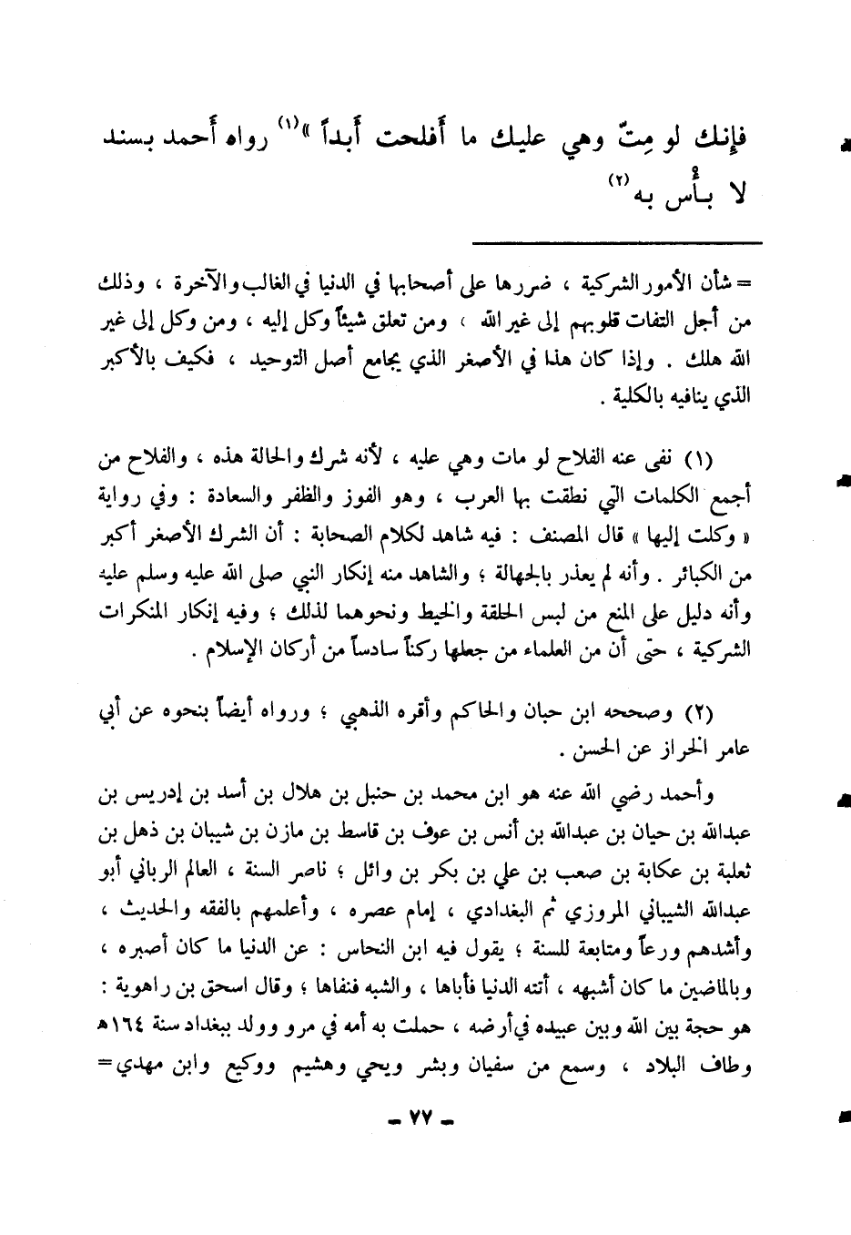 (1) نفى عنه الفلاح لو مات وهي عليه؛ لأنه شرك والحالة هذه، والفلاح من أجمع الكلمات التي نطقت بها العرب، وهو الفوز والظفر والسعادة. وفي رواية: "وكلت إليها". قال المصنف: ((فيه شاهد لكلام الصحابة: أن الشرك الأصغر أكبر من الكبائر، وأنه لم يعذر بالجهالة، والشاهد منه إنكار النبي صلى الله عليه وسلم عليه، وأنه دليل على المنع من لبس الحلقة والخيط ونحوهما لذلك، وفيه إنكار المنكرات الشركية حتى إن من العلماء من جعلها ركنا سادسا من أركان الإسلام)) .
