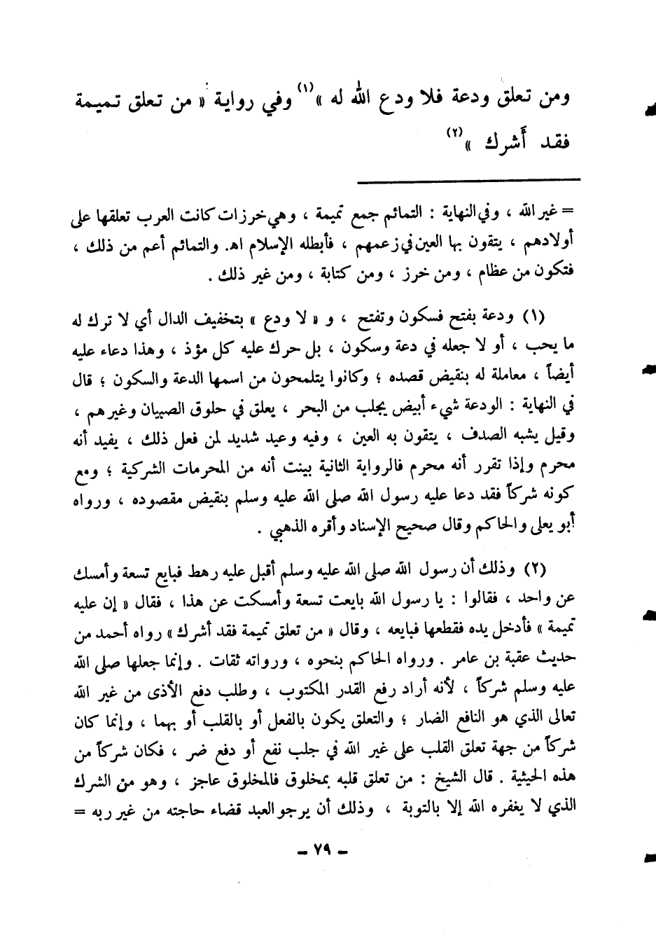 ومن تعلق ودعة فلا ودع الله له (1) "1. وفي رواية: " من تعلق تميمة فقد أشرك " 2.