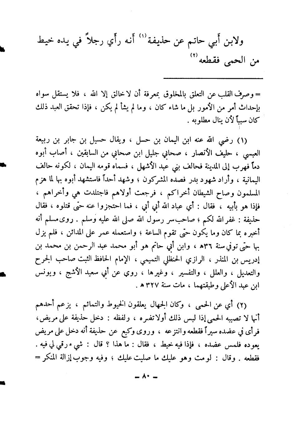 ولابن أبي حاتم عن حذيفة (1) أنه " رأي رجلا في يده خيط من الحمى فقطعه (2) ،