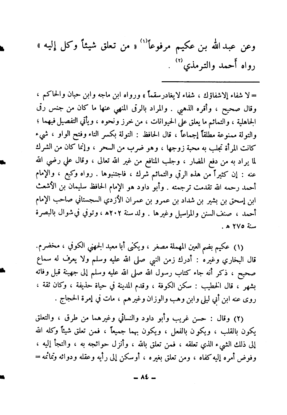 وعن عبد الله بن عكيم مرفوعا (1) : " من تعلق شيئا وُكِل إليه " 1. رواه أحمد والترمذي (2) .