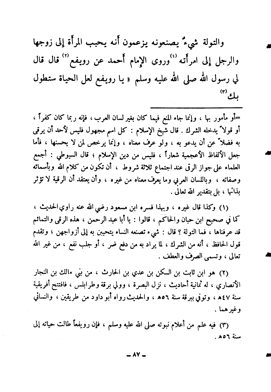 (1) وكذا قال غيره، وبهذا فسره ابن مسعود رضي الله عنه راوي الحديث، كما في صحيح ابن حبان والحاكم، قالوا: " يا أبا عبد الرحمن، هذه الرقى والتمائم قد عرفناها، فما التولة؟ قال: شيء تصنعه النساء يتحببن به إلى أزواجهن " وتقدم قول الحافظ، أنه من الشرك؛ لما يراد به من دفع ضر، أو جلب نفع من غير الله تعالى، وتسمى الصرف والعطف.