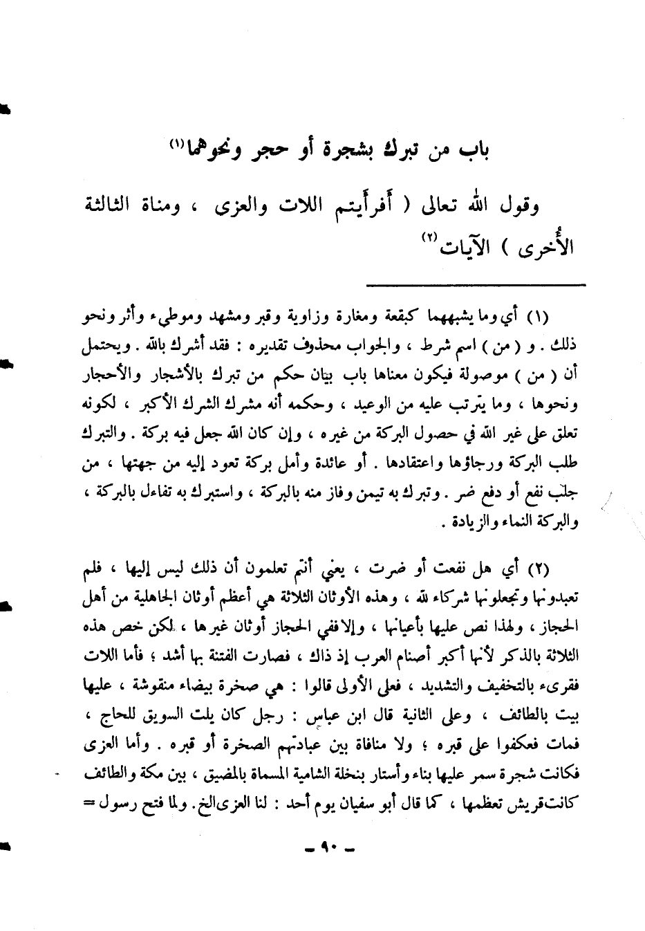 (1) أي وما يشبههما كبقعة ومغارة وزاوية وقبر ومشهد وموطئ وأثر ونحو ذلك. و (من) اسم شرط، والجواب محذوف تقديره: فقد أشرك بالله. ويحتمل أن (من) موصولة فيكون معناها باب بيان حكم من تبرك بالأشجار والأحجار ونحوها، وما يترتب عليه من الوعيد، وحكمه أنه مشرك الشرك الأكبر؛ لكونه تعلق على غير الله في حصول البركة من غيره، وإن كان الله جعل فيه بركة. والتبرك طلب البركة ورجاؤها واعتقادها، أو عائدة وأمل بركة تعود إليه من جهتها، من جلب نفع أو دفع ضر. وتبرك به تيمن وفاز منه بالبركة، واستبرك به تفاءل بالبركة، والبركة النماء والزيادة.