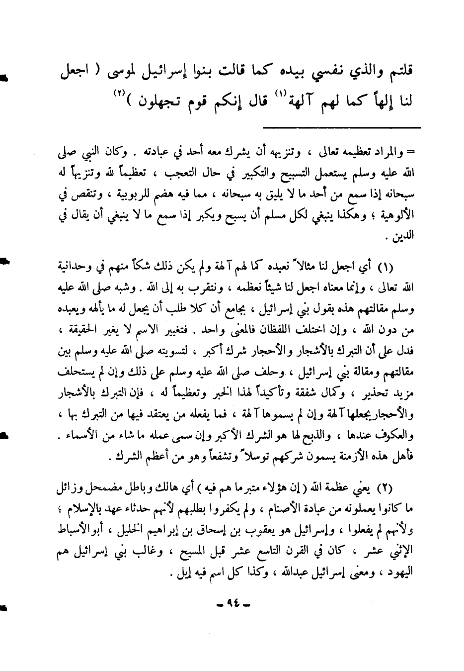 (1) أي اجعل لنا مثالا نعبده كما لهم آلهة، ولم يكن ذلك شكا منهم في وحدانية الله تعالى، وإنما معناه اجعل لنا شيئا نعظمه، ونتقرب به إلى الله. وشبه صلى الله عليه وسلم مقالتهم هذه بقول بني إسرائيل، بجامع أن كلا طلب أن يجعل له ما يألهه ويعبده من دون الله، وإن اختلف اللفظان فالمعنى واحد. فتغيير الاسم لا يغير الحقيقة، فدل على أن التبرك بالأشجار والأحجار شرك أكبر، لتسويته صلى الله عليه وسلم بين مقالتهم ومقالة بني إسرائيل، وحلف صلى الله عليه وسلم على ذلك وإن لم يستحلف مزيد تحذير وكمال شفقة، وتأكيدا لهذا الخبر وتعظيما له، فإن التبرك بالأشجار والأحجار يجعلها آلهة وإن لم يسموها آلهة، فما يفعله من يعتقد فيها من التبرك بها، والعكوف عندها، والذبح لها هو الشرك الأكبر وإن سمى عمله ما شاء من الأسماء. فأهل هذه الأزمنة يسمون شركهم توسلا وتشفعا وهو من أعظم الشرك.