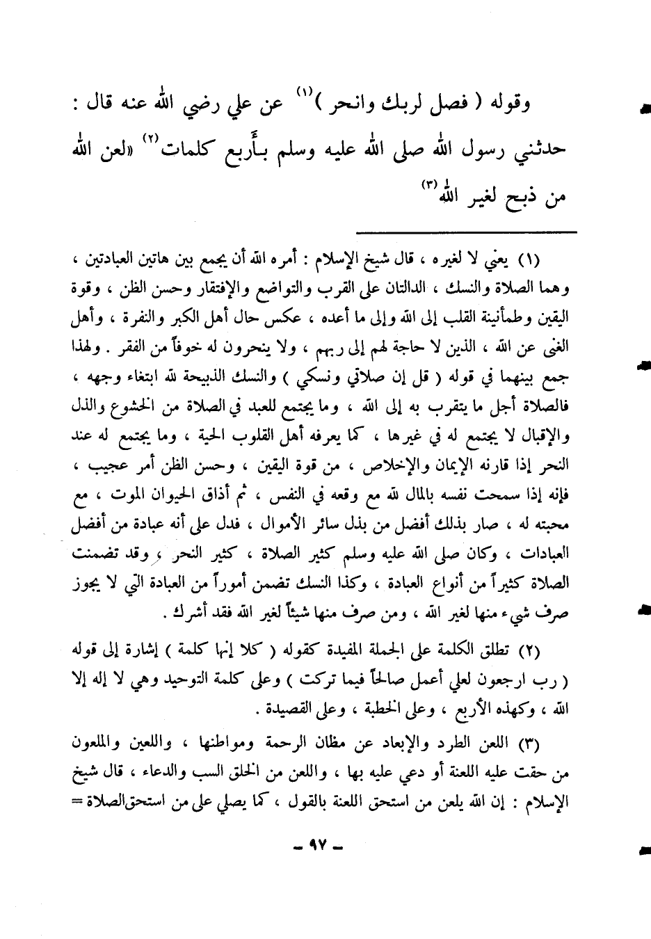 وقوله: {فَصَلِّ لِرَبِّكَ وَانْحَرْ} 1 (1) . عن علي رضي الله عنه قال: حدثني رسول الله صلى الله عليه وسلم بأربع كلمات: (2) " لعن الله من ذبح لغير الله (3) ،