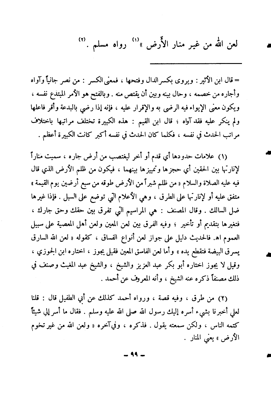(1) علامات حدودها أي قدم أو أخر ليغتصب من أرض جاره، سميت منارا لإنارتها بين الحقين أي حجزها وتمييزها بينهما، فيكون من ظلم الأرض الذي قال فيه -عليه الصلاة والسلام-: " من ظلم شبرا من الأرض طوقه من سبع أرضين يوم القيامة "2. متفق عليه. أو لإنارتها على الطرق، وهي الأعلام التي توضع على السبل، فإذا غيرها ضل السالك. وقال المصنف: ((هي المراسيم التي تفرق بين حقك وحق جارك، فتغيرها بتقديم أو تأخير; وفيه الفرق بين لعن المعين ولعن أهل المعصية على سبيل العموم)) اهـ. فالحديث دليل على جواز لعن أنواع الفساق، كقوله: " لعن الله السارق يسرق البيضة فتقطع يده " 3. وأما لعن الفاسق المعين فقيل: يجوز، اختاره ابن الجوزي. وقيل: لا يجوز اختاره أبو بكر عبد العزيز والشيخ، والشيخ عبد المغيث وصنف في ذلك مصنفا ذكره عنه الشيخ، وأنه المعروف عن أحمد.