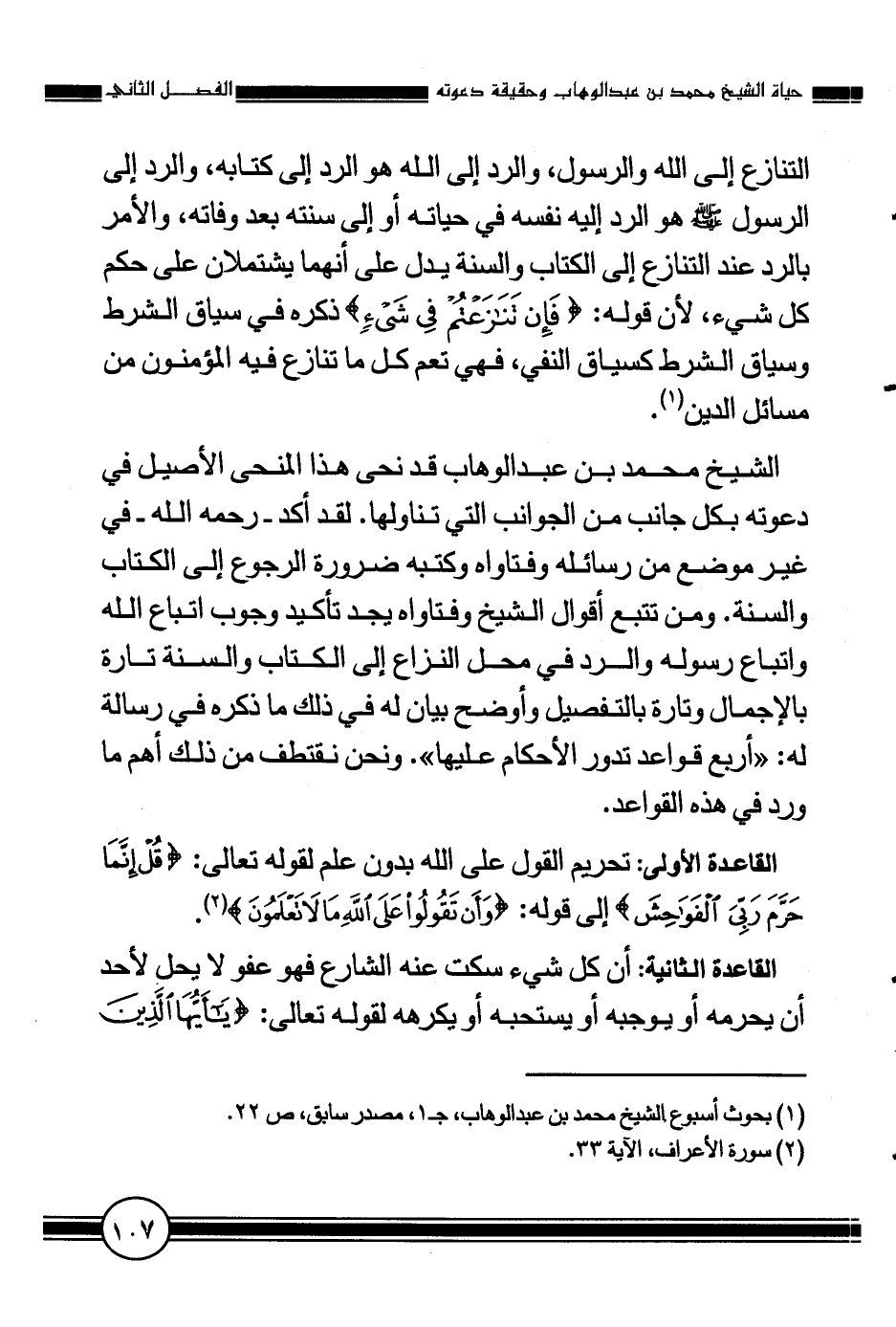الشيخ محمد بن عبد الوهاب قد نحى هذا المنحى الأصيل في دعوته بكل جانب من الجوانب التي تناولها. لقد أكد- رحمه الله- في غير موضع من رسائله وفتاواه وكتبه ضرورة الرجوع إلى الكتاب والسنة. ومن تتبع أقوال الشيخ وفتاواه يجد تأكيد وجوب اتباع الله واتباع رسوله والرد في محل النّزاع إلى الكتاب والسنة تارة بالإجمال وتارة بالتفصيل، وأوضح بيان له في ذلك ما ذكره في رسالة له "أربع قواعد تدور الأحكام عليها". ونحن نقتطف من ذلك أهم ما ورد في هذه القواعد.