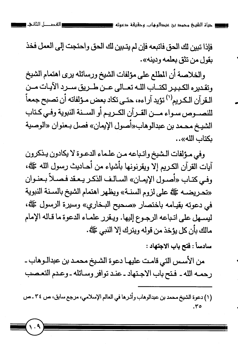 من الأسس التي قامت عليها دعوة الشيخ محمد بن عبد الوهاب- رحمه الله- فتح باب الاجتهاد- عند توافر وسائله- وعدم التعصب