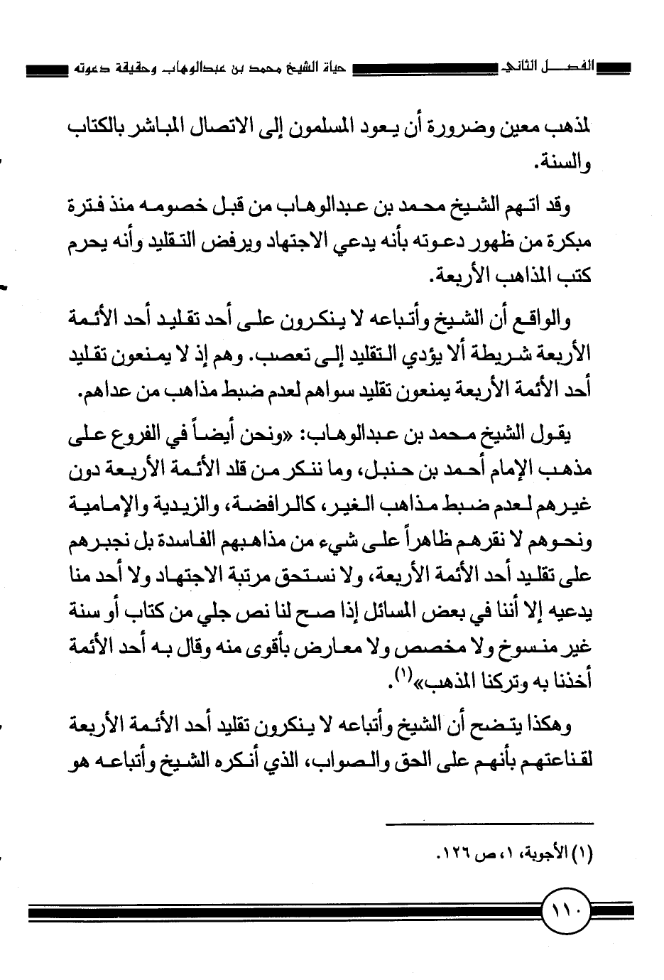 والواقع أن الشيخ وأتباعه لا ينكرون على أحد تقليد أحد الأئمة الأربعة شريطة ألا يؤدي التقليد إلى تعصب. وهم إذ لا يمنعون تقليد أحد الأئمة الأربعة يمنعون تقليد سواهم لعدم ضبط مذاهب من عداهم.
