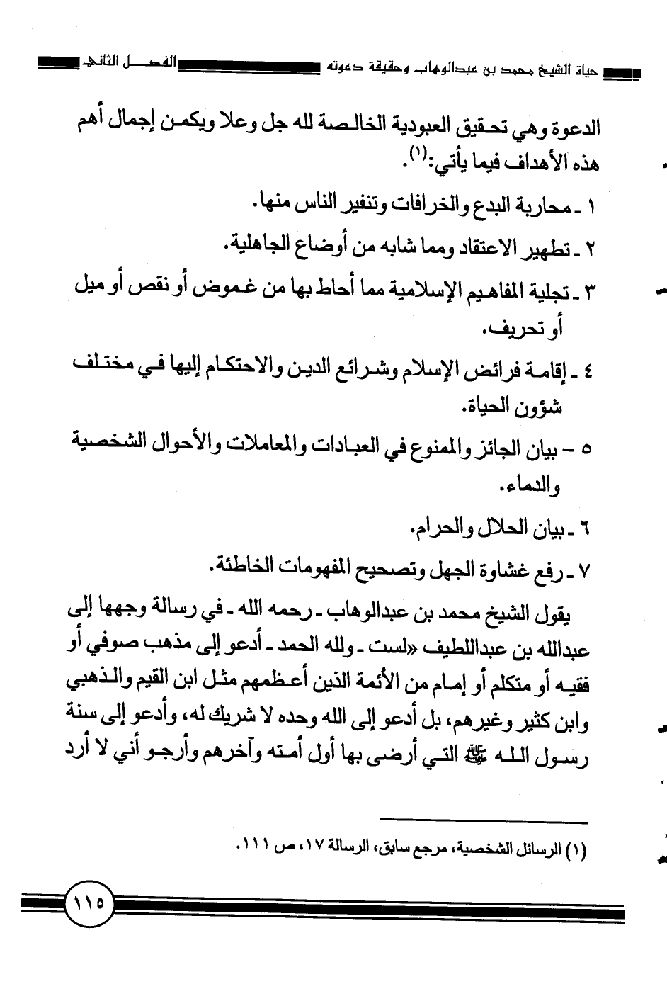 يقول الشيخ محمد بن عبد الوهاب - رحمه الله - في رسالة وجهها إلى عبد الله ابن عبد اللطيف، "لست - ولله الحمد - أدعو إلى مذهب صوفي أو فقيه أو متكلم أو إمام من الأئمة الذين أعظمهم مثل ابن القيم والذهبي وابن كثير وغيرهم، بل أدعو إلى الله وحده لا شريك له، وأدعو إلى سنة رسول الله صلّى الله عليه وسلّم التي أرضى بها أول أمته وآخرهم وأرجو أني لا أرد